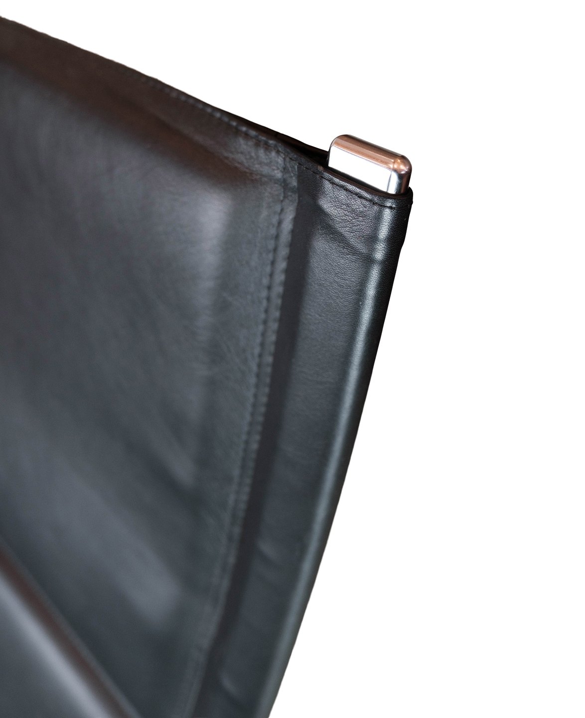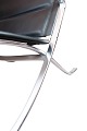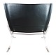 Lænestol, model FK82 - X-chair, designet af Preben Fabricius og Jørgen Kastholm i 1968 og fremstillet af Lange Production. Stolen er polstret med sort læder samt polstret armlæn.