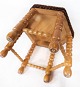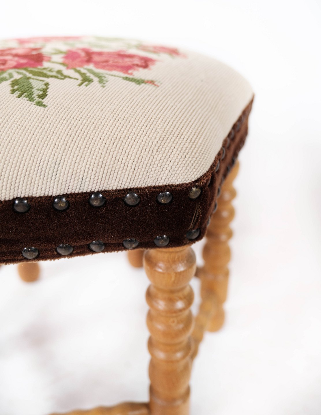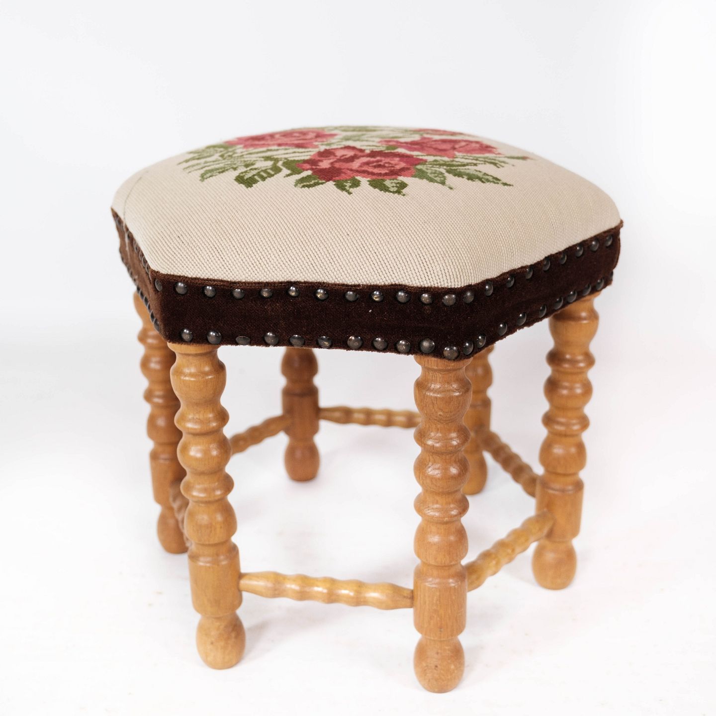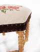 Skammel af lyst træ og polstret med broderet stof fra 1970erne. Skamlen er i flot brugt stand.