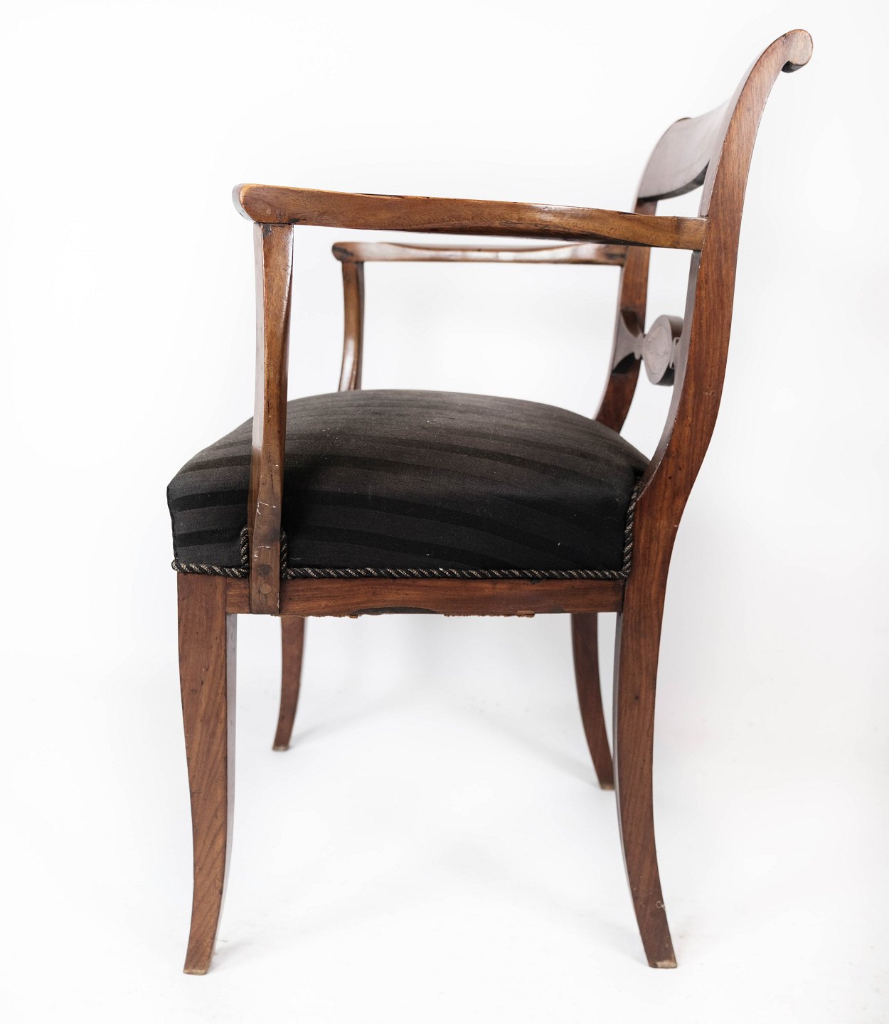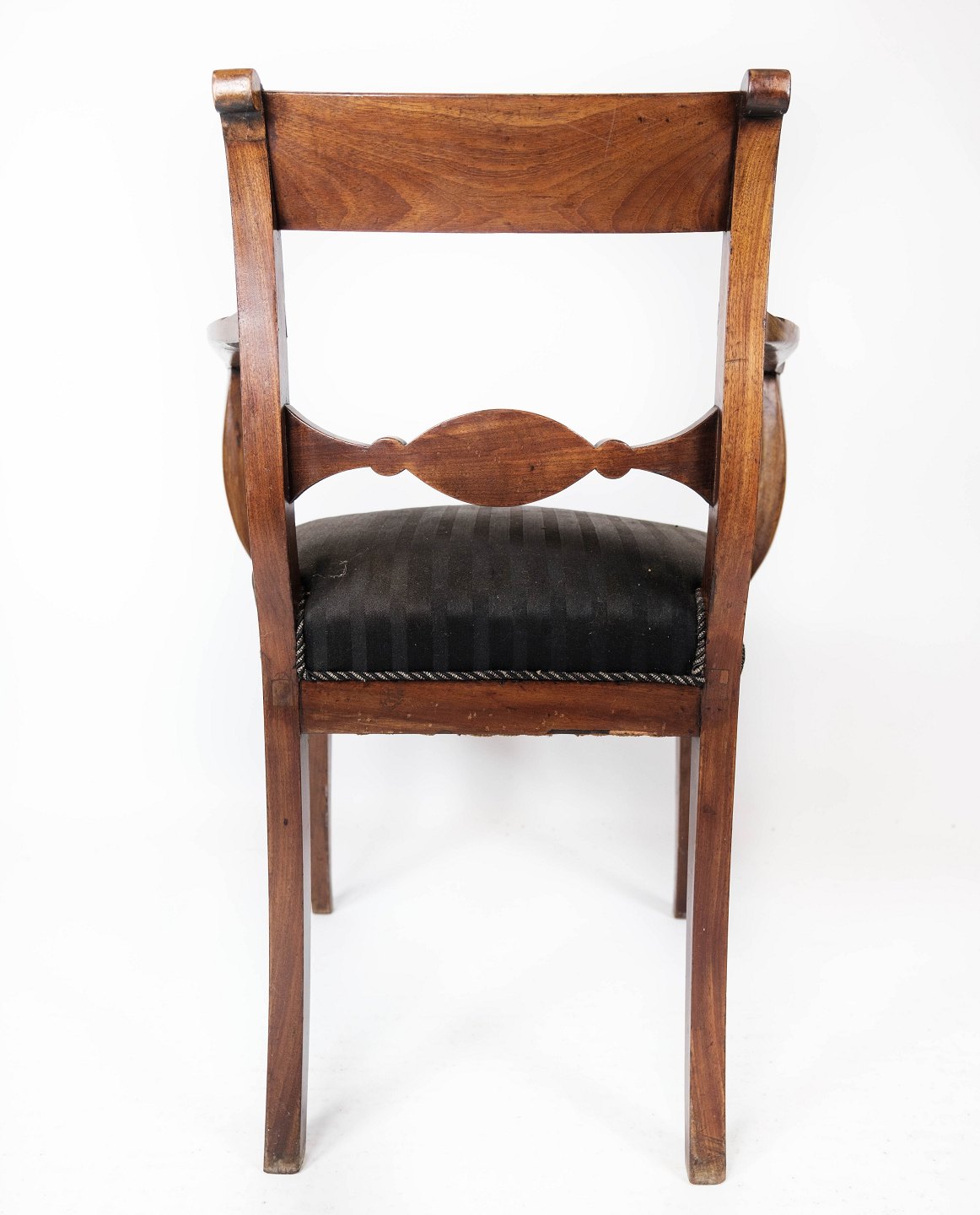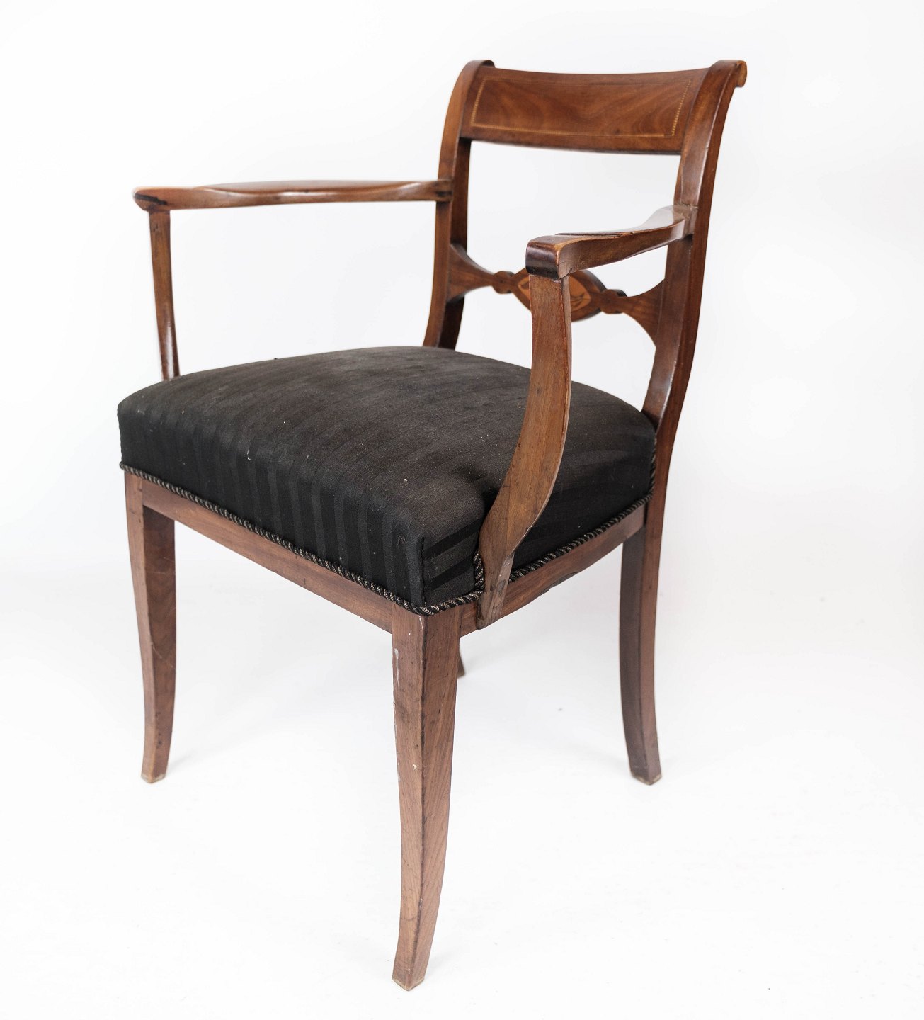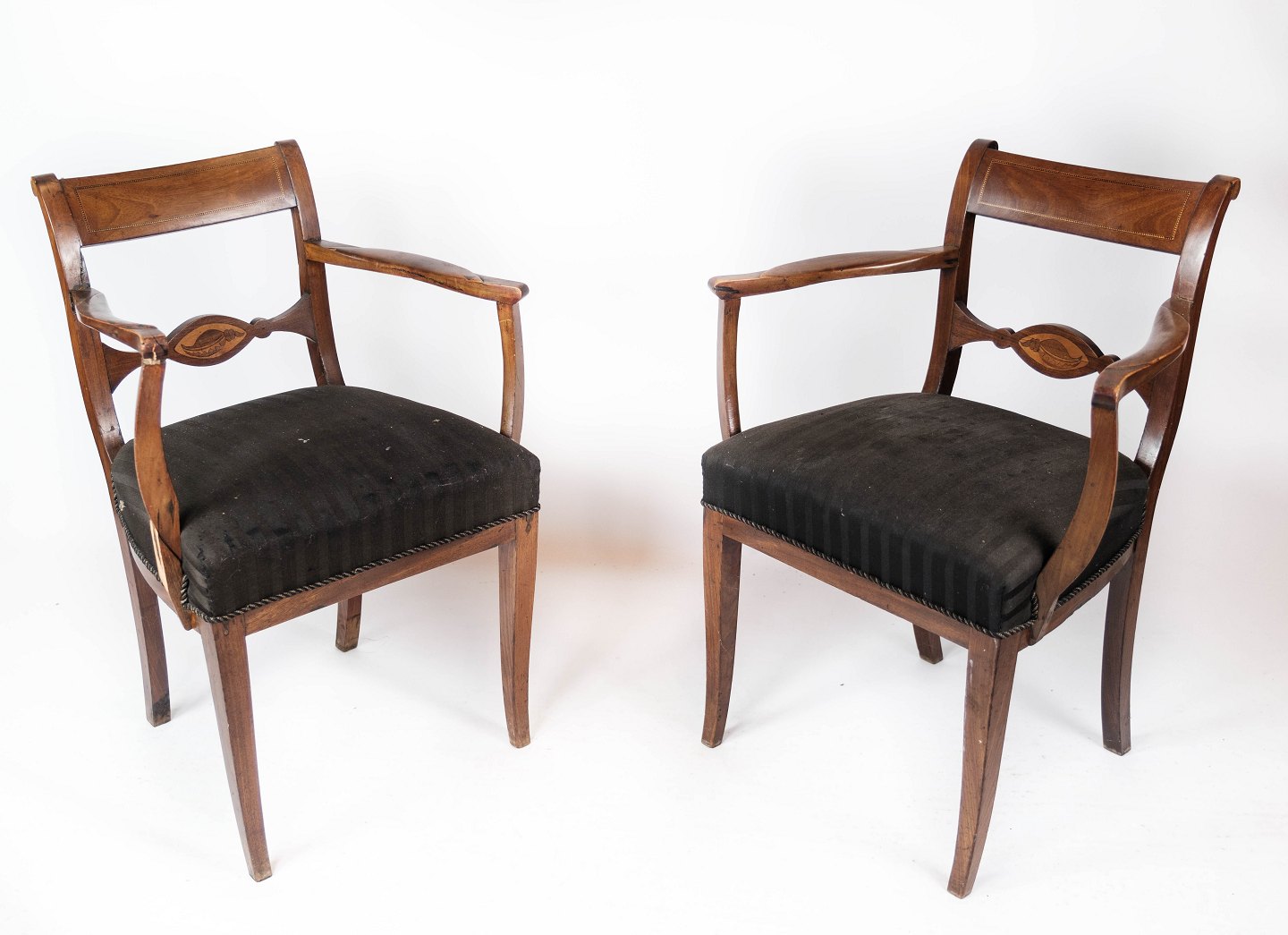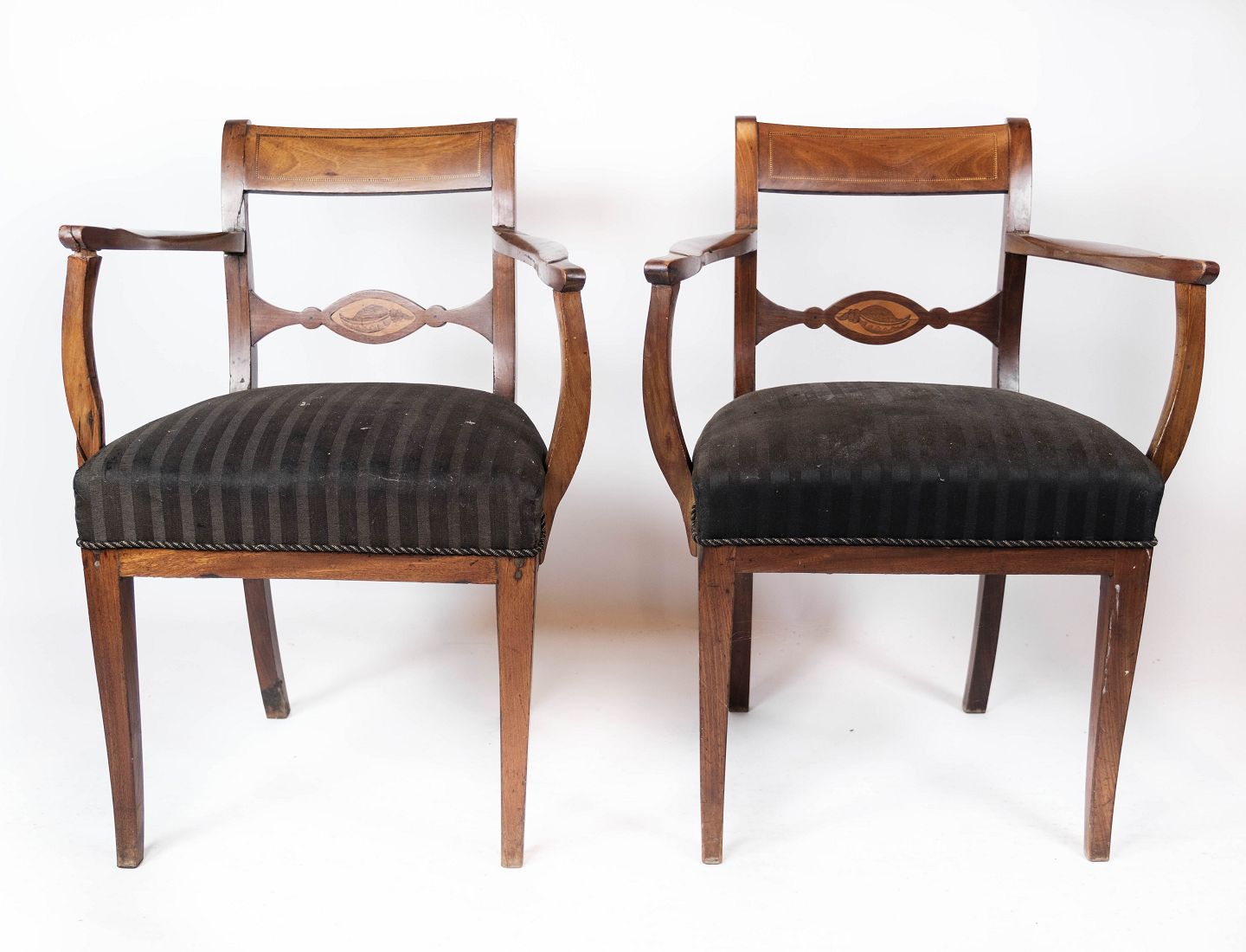 Satz von zwei Armlehnstühlen aus Mahagoni, bezogen mit schwarzem Stoff, aus den 1860er-Jahren.