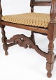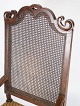 Antik armstol af eg, med original polstring af lyst stof og rørflet, fra 1920erne.