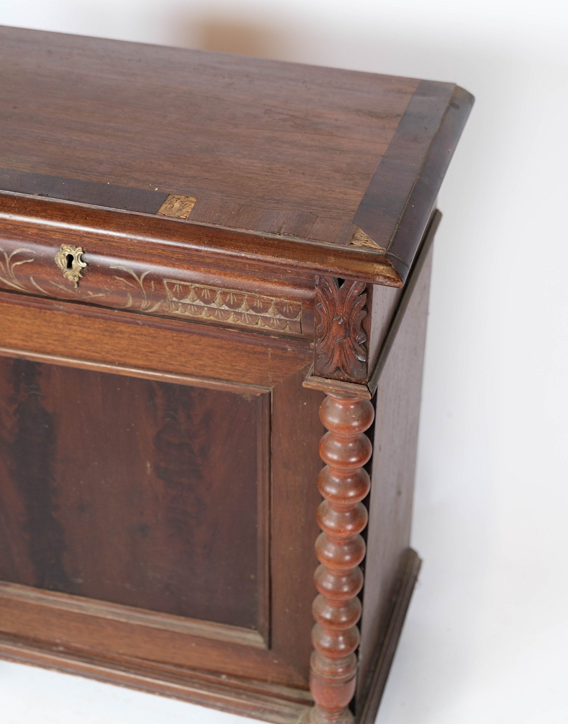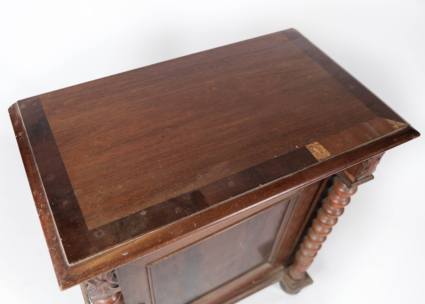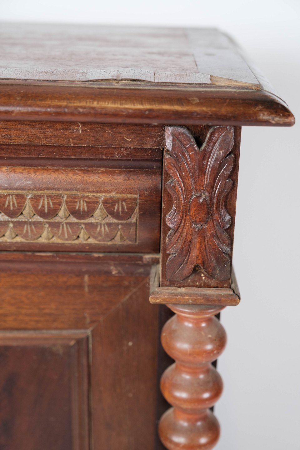 Mindre antikt skab af mahogni dekoreret med udskæringer, fra 1880erne.