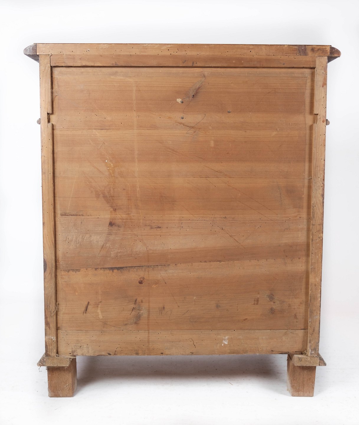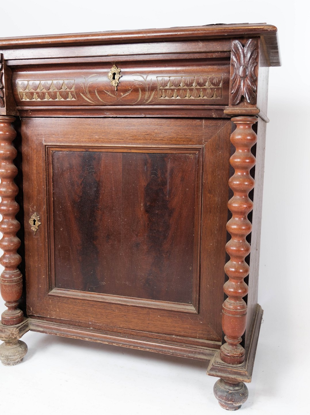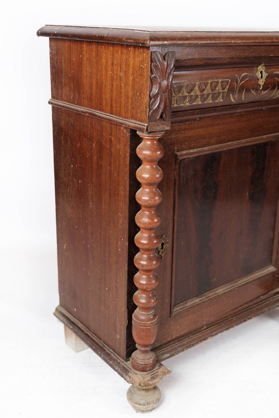 Mindre antikt skab af mahogni dekoreret med udskæringer, fra 1880erne.