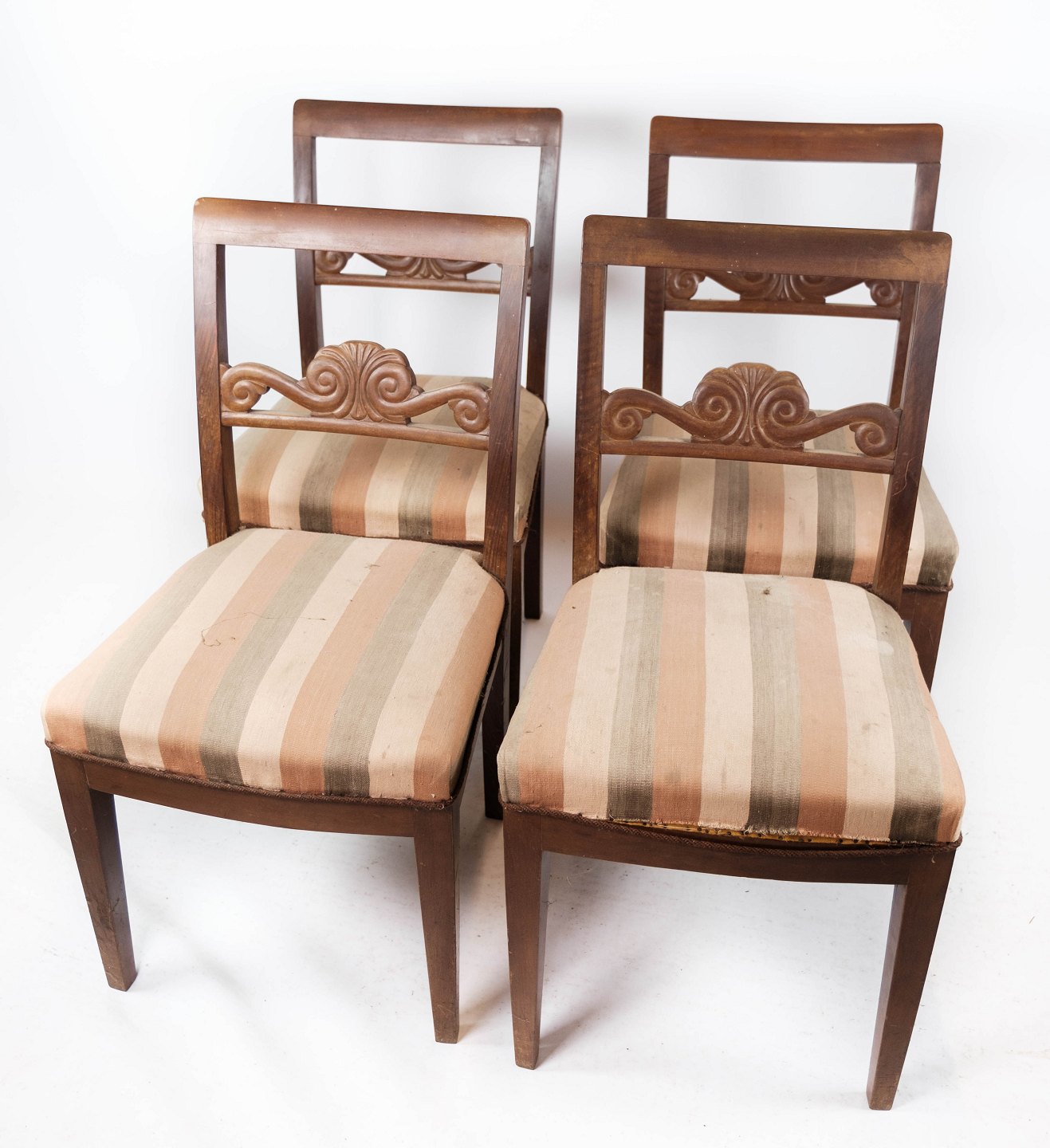 Sæt af fire spisestuestole af mahogni og med originalt stribet polstring, fra 1910erne.