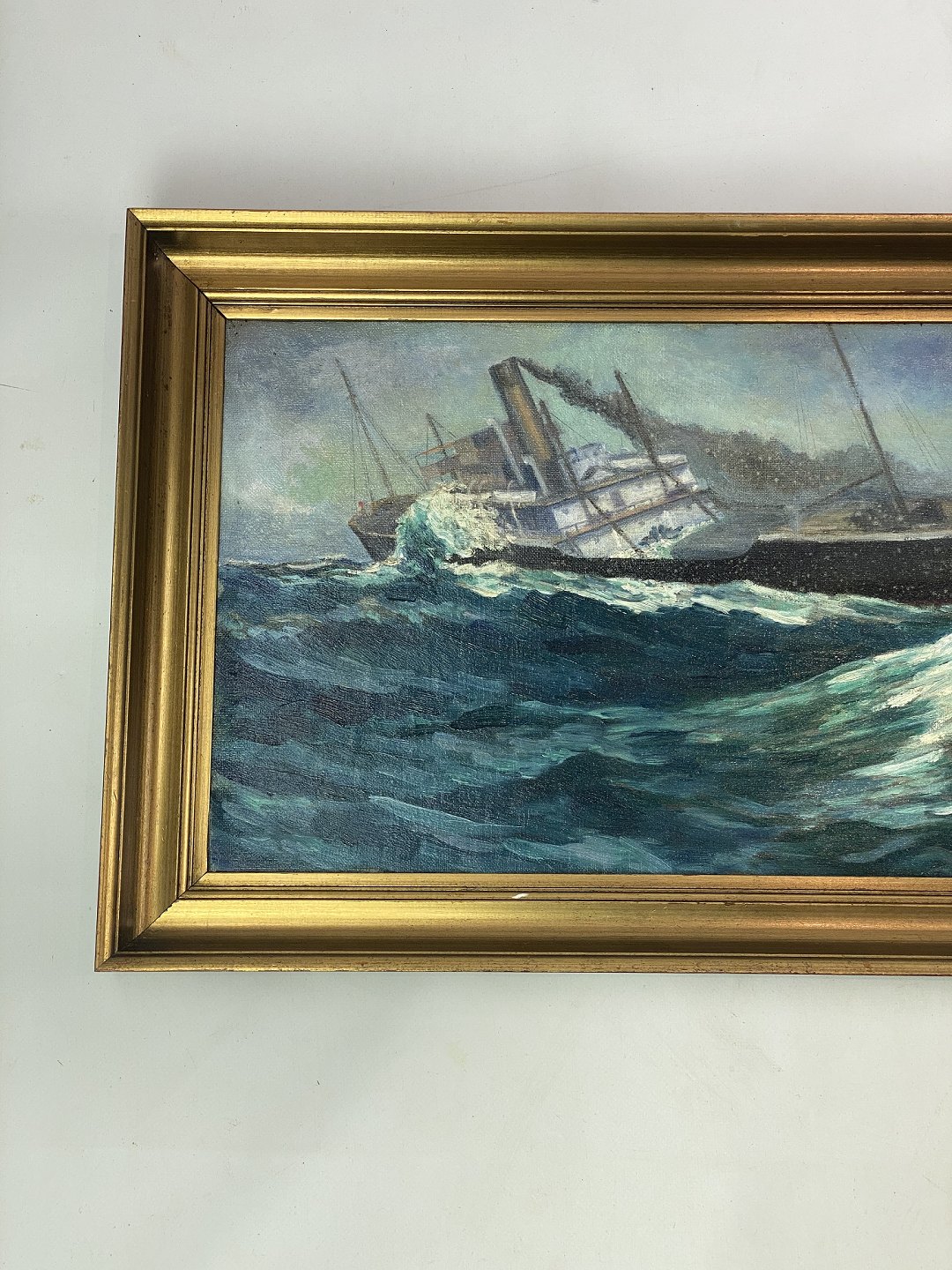 Maleri på lærred med marine motiv og forgyldt ramme signeret JN af Jens Nielsen i 1938.