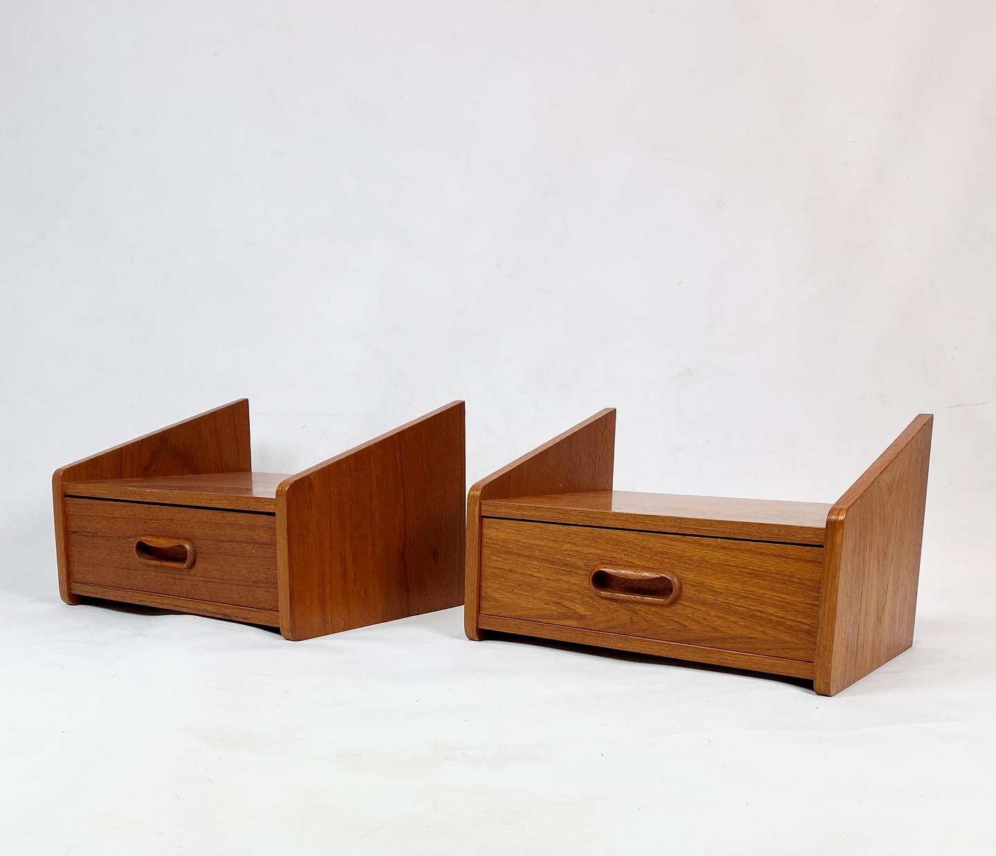 A set of bedside tables with drawer in teak of Danish design from the 1960s. The items are in great vintage condition.