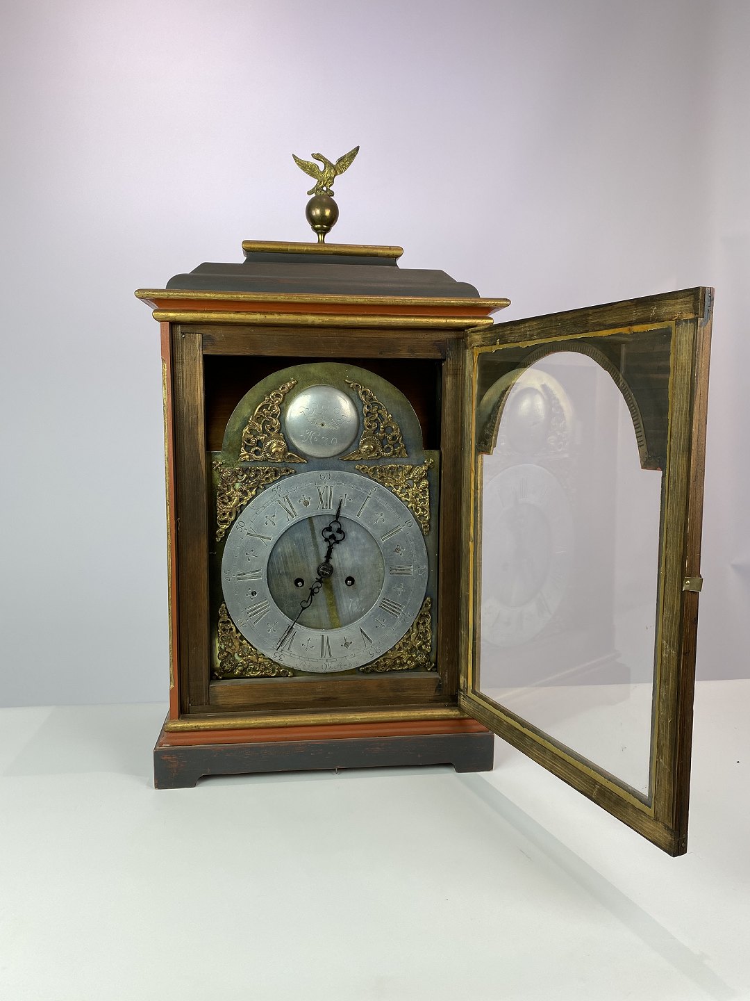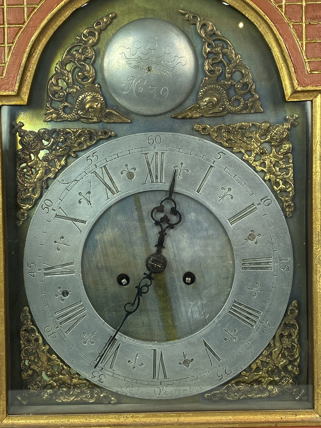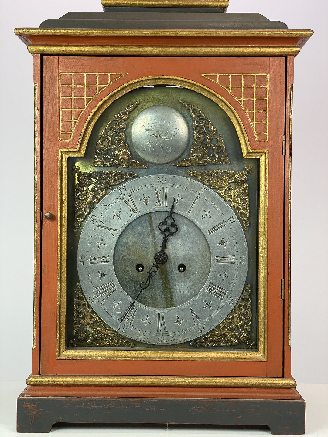 SoldFireplace clock painted and of brass, as well as decorated with figurine of brass, from around 1860. The dial is of brass and tin.