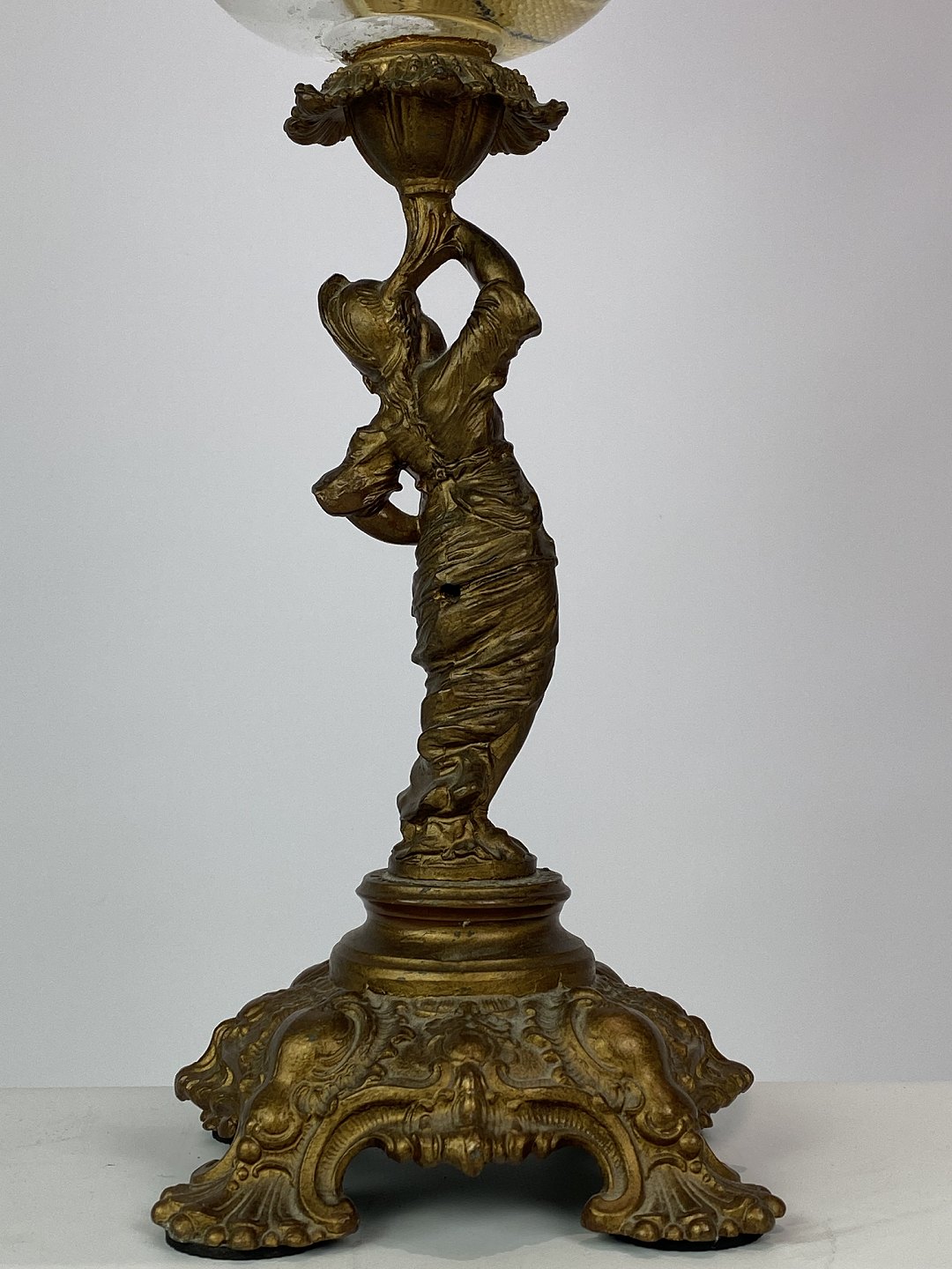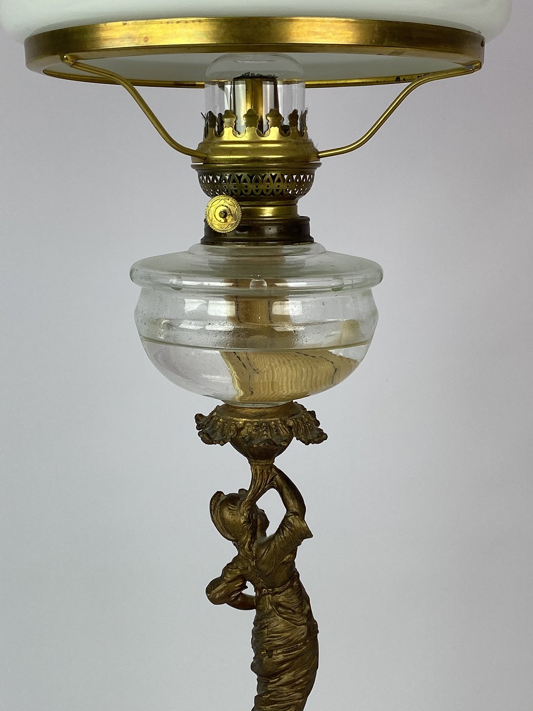 Petroleumslampe af patineret metal og skærm af hvid opalglas fra omkring 1860. Lampen er i flot antik stand.