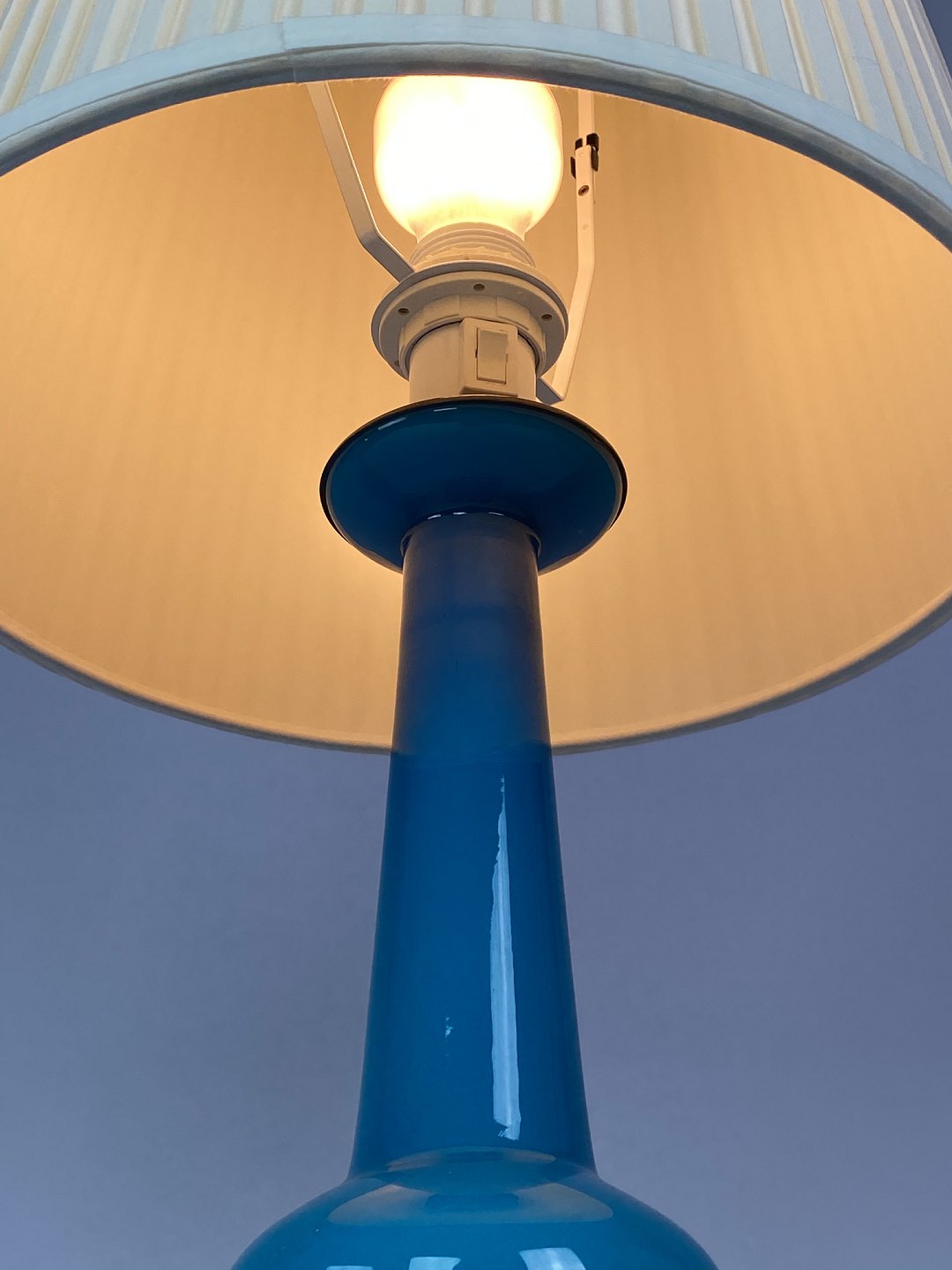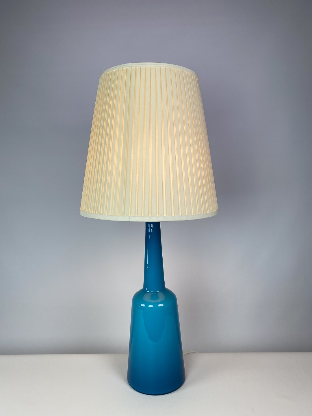SolgtEt par bordlamper af blåt opal glas fremstillet af Kastrup Glasfabrik fra omkring 1950erne. Lamperne er i flot brugt stand.