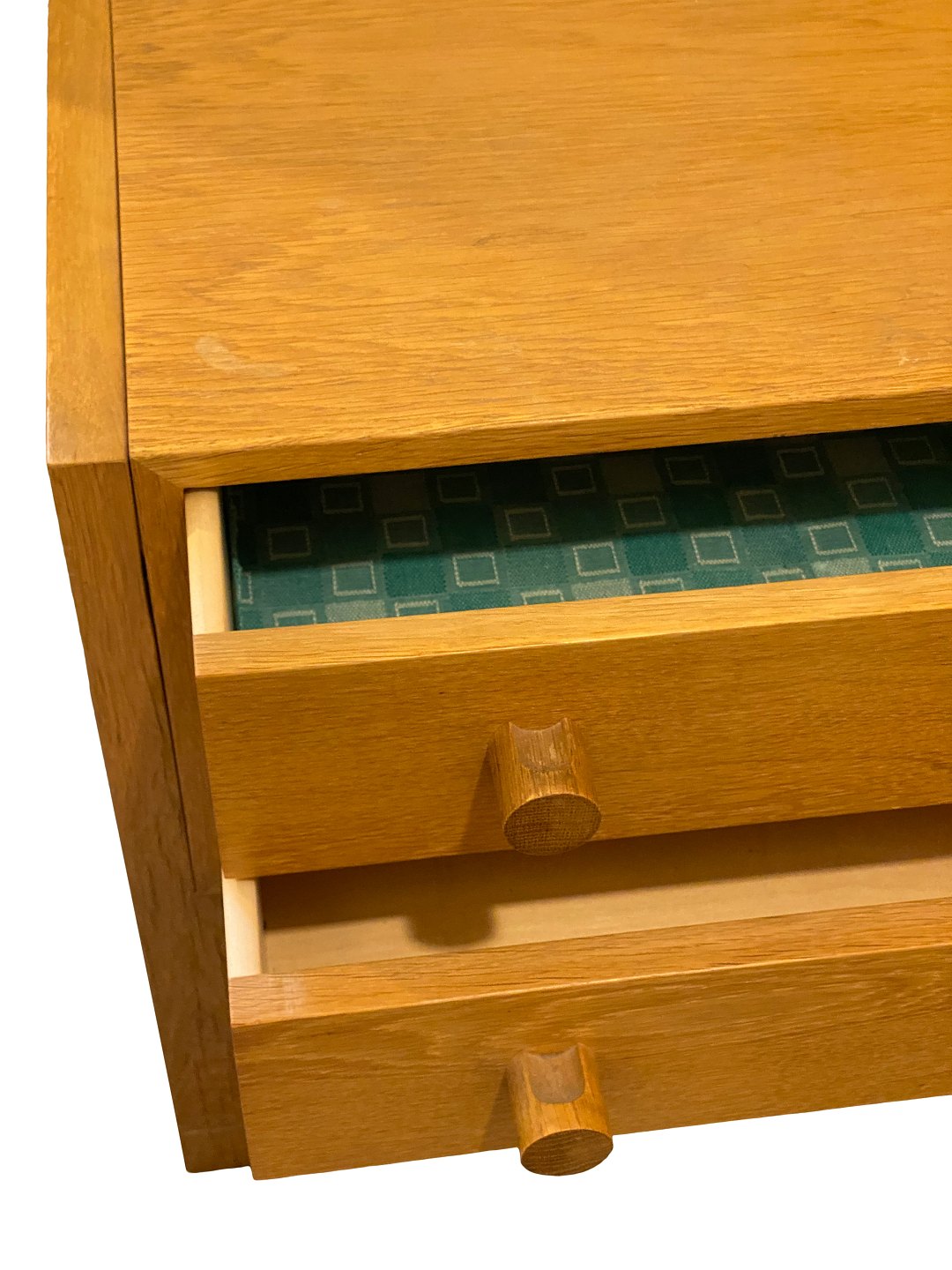 Få et stykke dansk designhistorie med dette smukke entre-sæt bestående af et spejl og en lav kommode, begge i lys eg og fra 1960'erne. Dette sæt repræsenterer den karakteristiske stil og æstetik, der var typisk for dansk møbeldesign på det tidspunkt.
