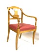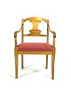 Et par senempire hvilestole i lyst træ, polstret med rødt stof og fra omkring 1840'erne, udgør et smukt og tidstypisk indslag i enhver indretning med deres klassiske udseende og historiske charme.