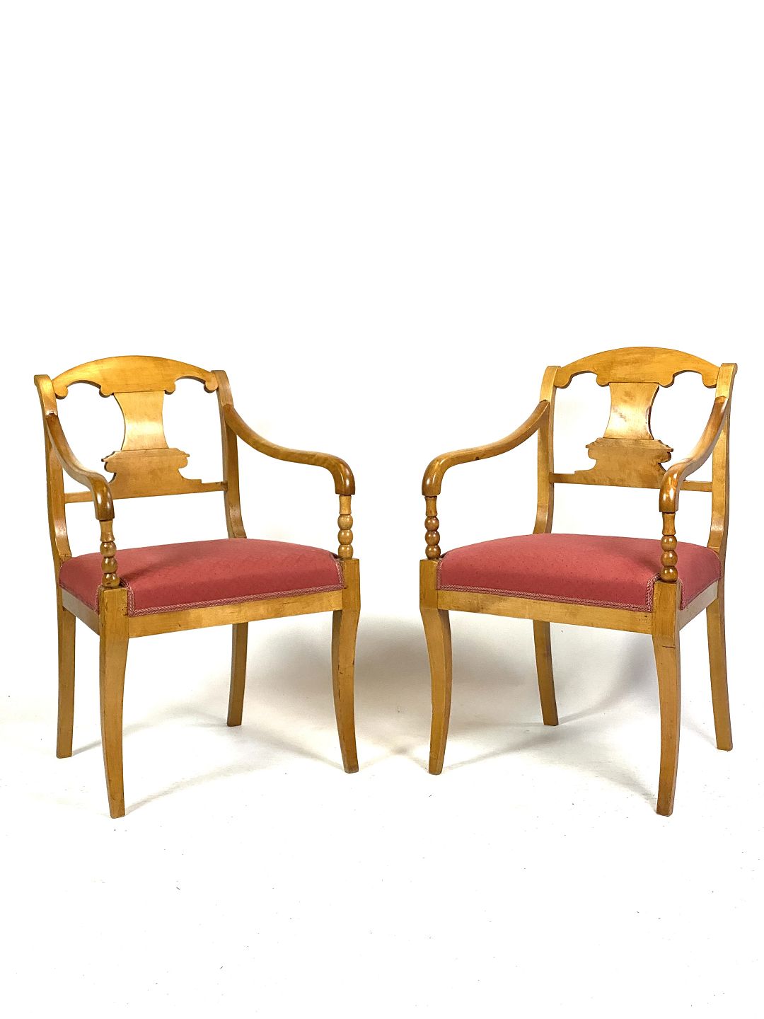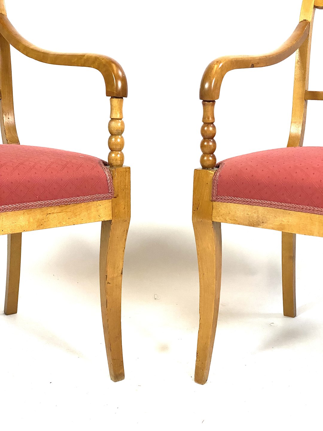 Disse stole, skabt i senempire-stil, er fremstillet af lyst træ, der giver dem en let og elegant fremtoning. Den røde polstring tilfører en varm og indbydende kontrast, samtidig med at den skaber en luksuriøs følelse af komfort og stil.