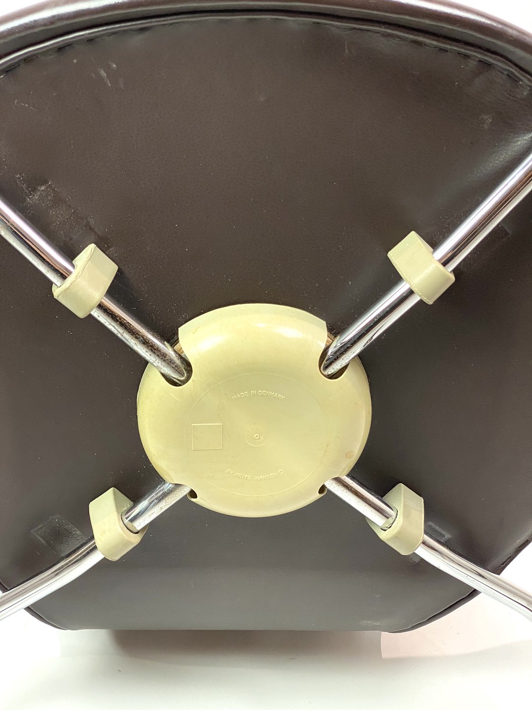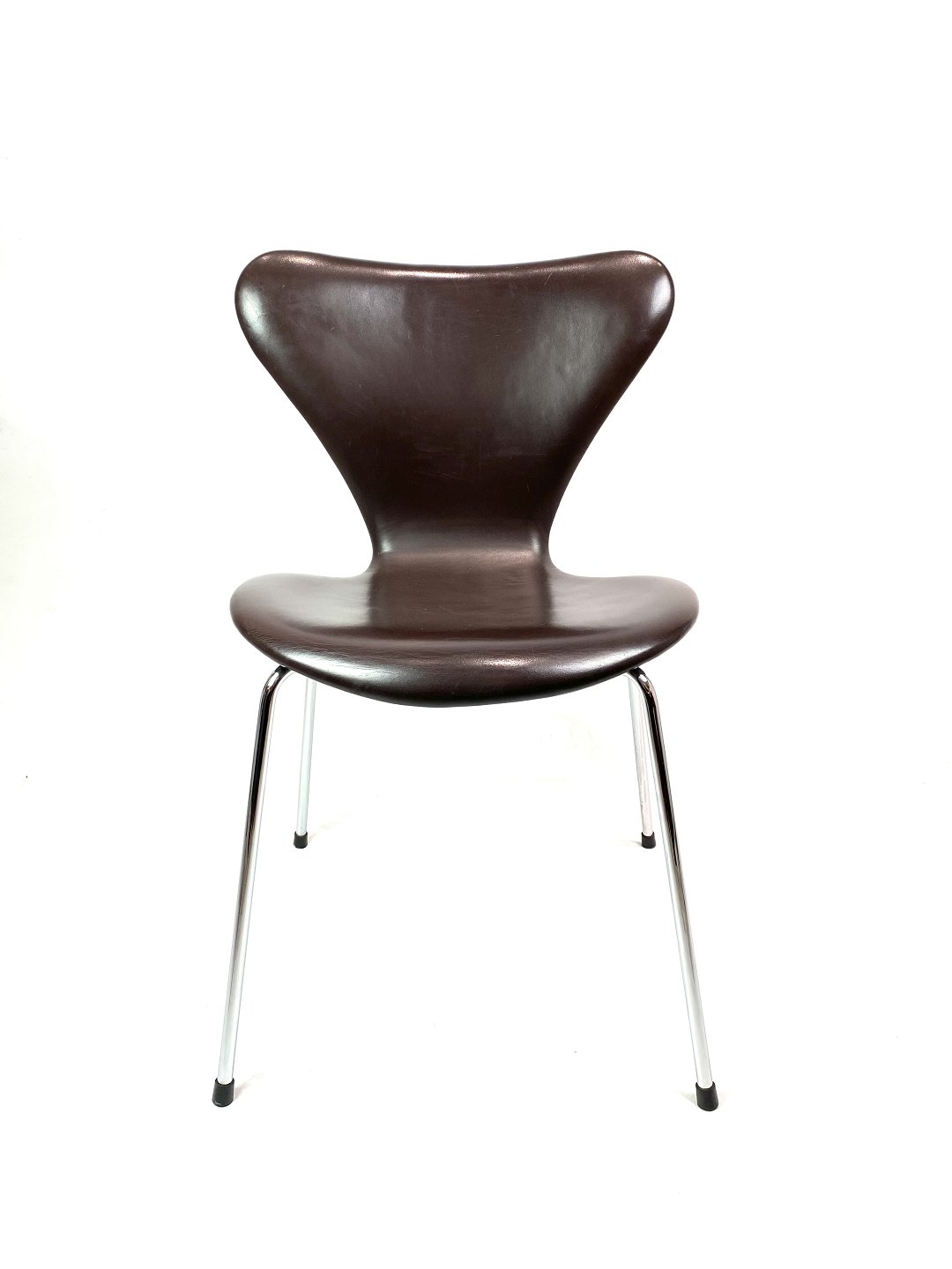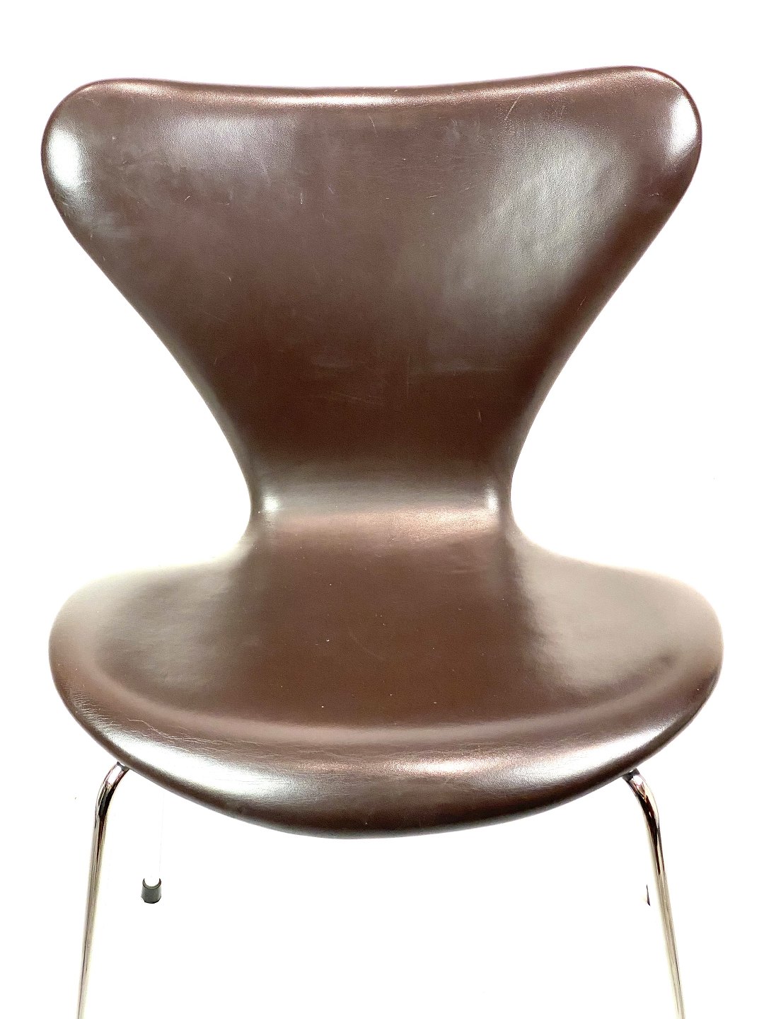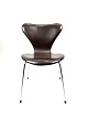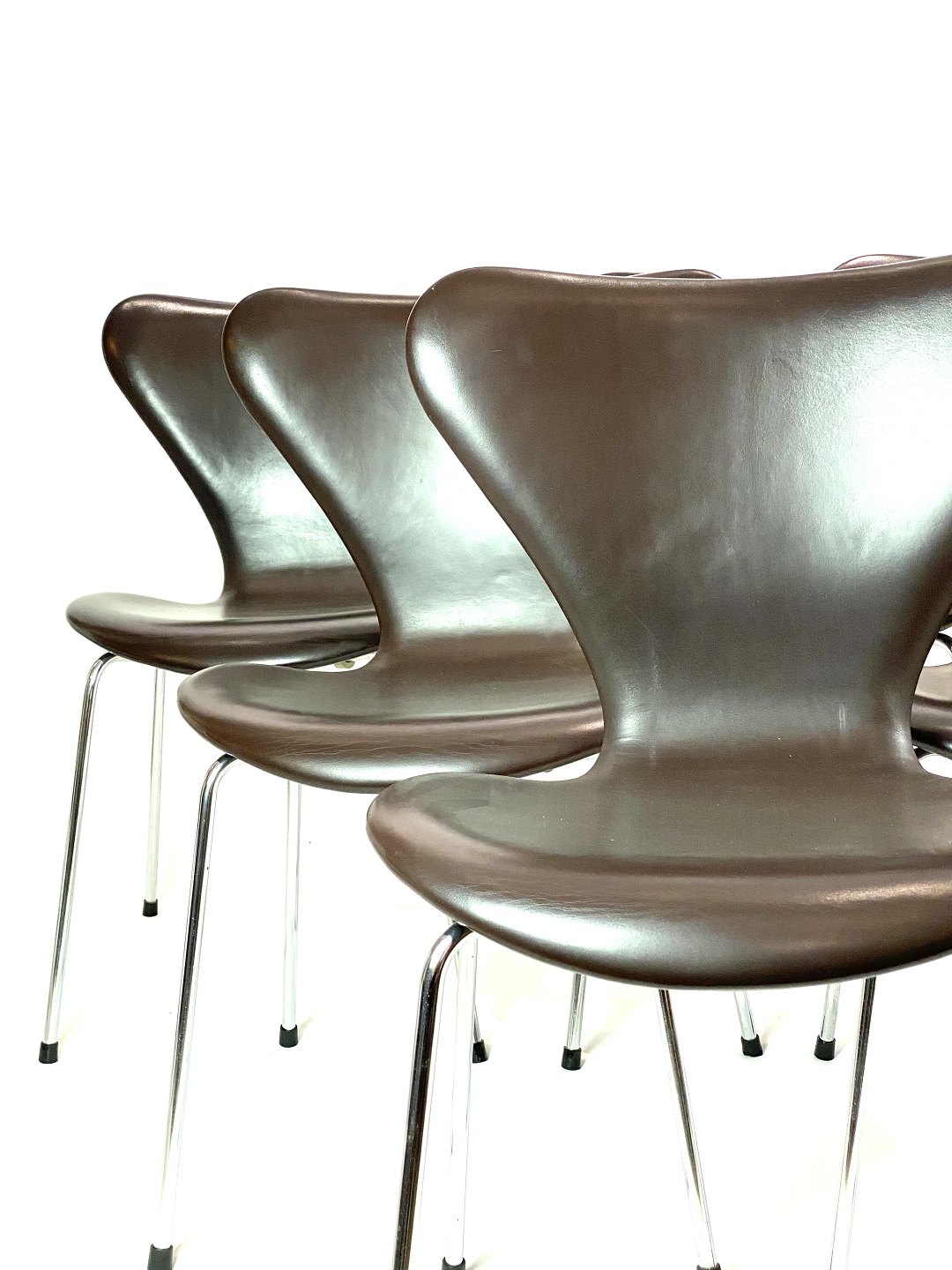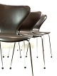 SolgtEt sæt af 6 Syver stole, model 3107, designet af Arne Jacobsen og fremstillet af Fritz Hansen. Stolene er polstret i mørkebrunt elegance læder.