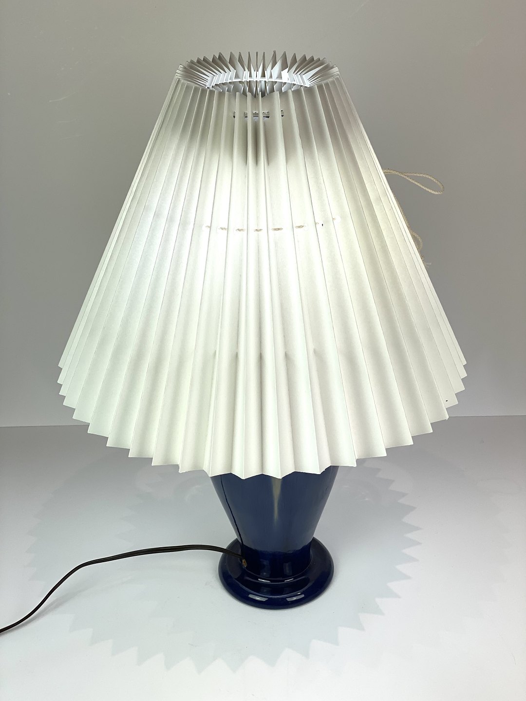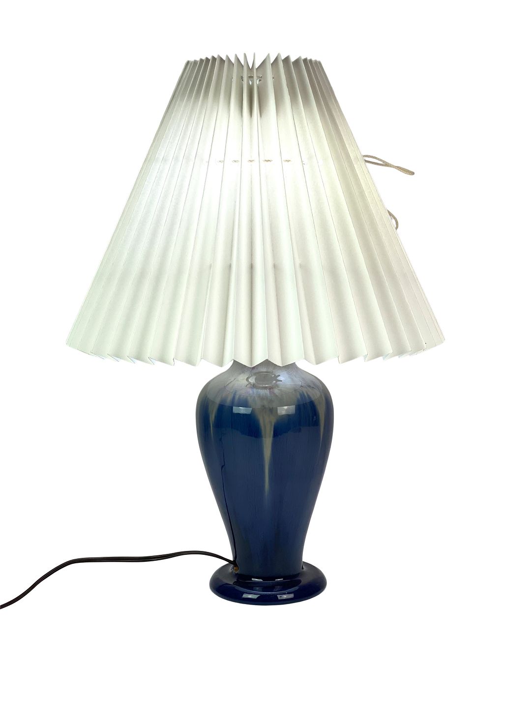 Ceramic table lamp with blue glaze and paper shade, by Michael Andersen.