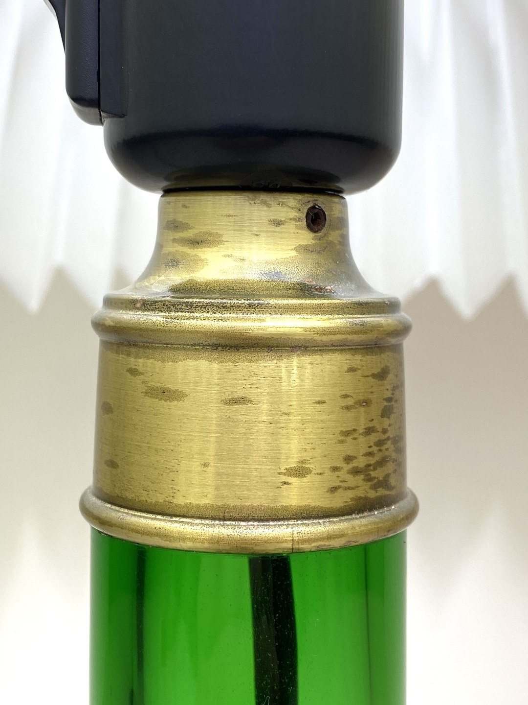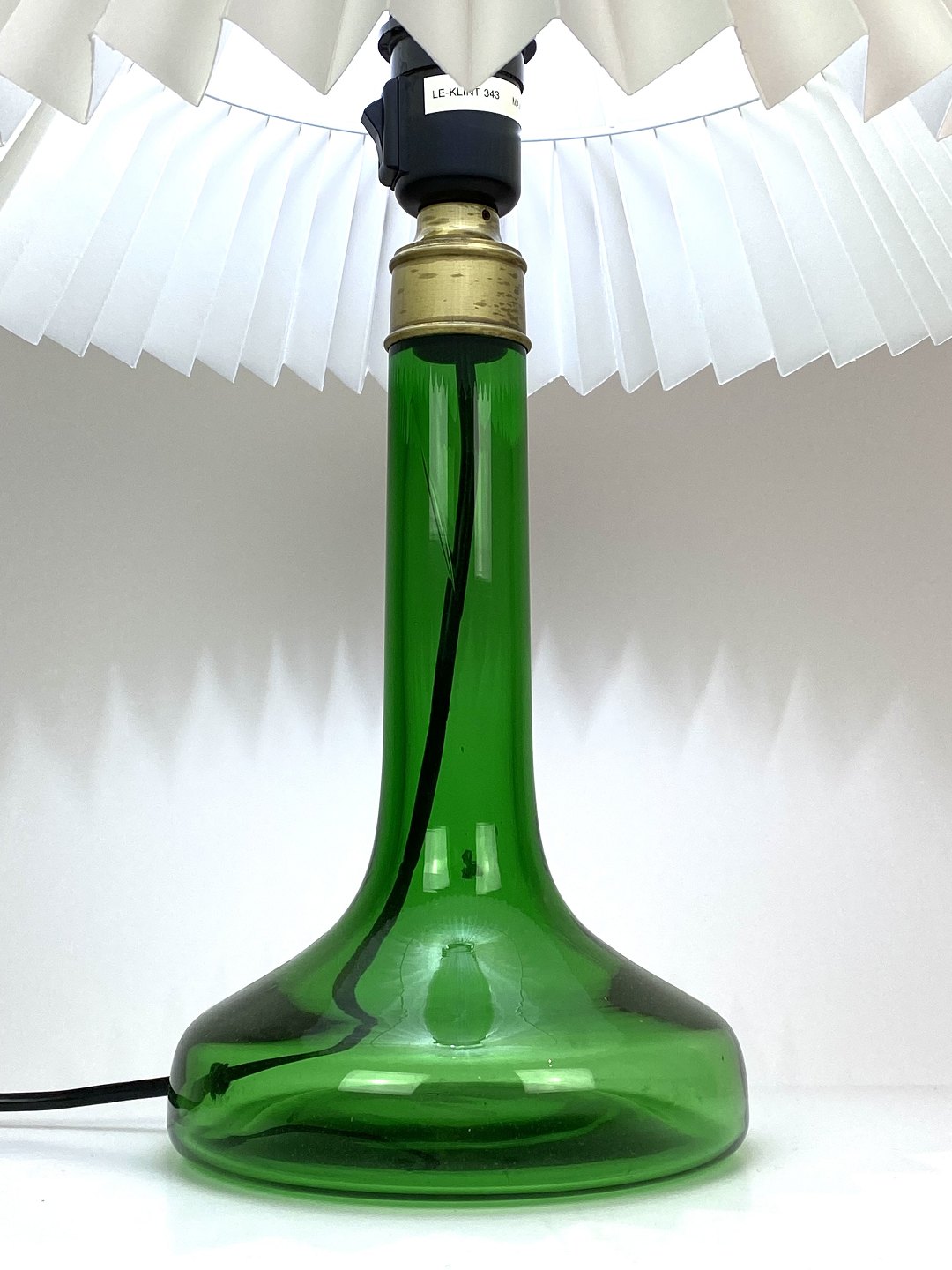 SolgtBordlampe af grønt glas med papirskærm, af Holmegaard. Lampen er i flot brugt stand.