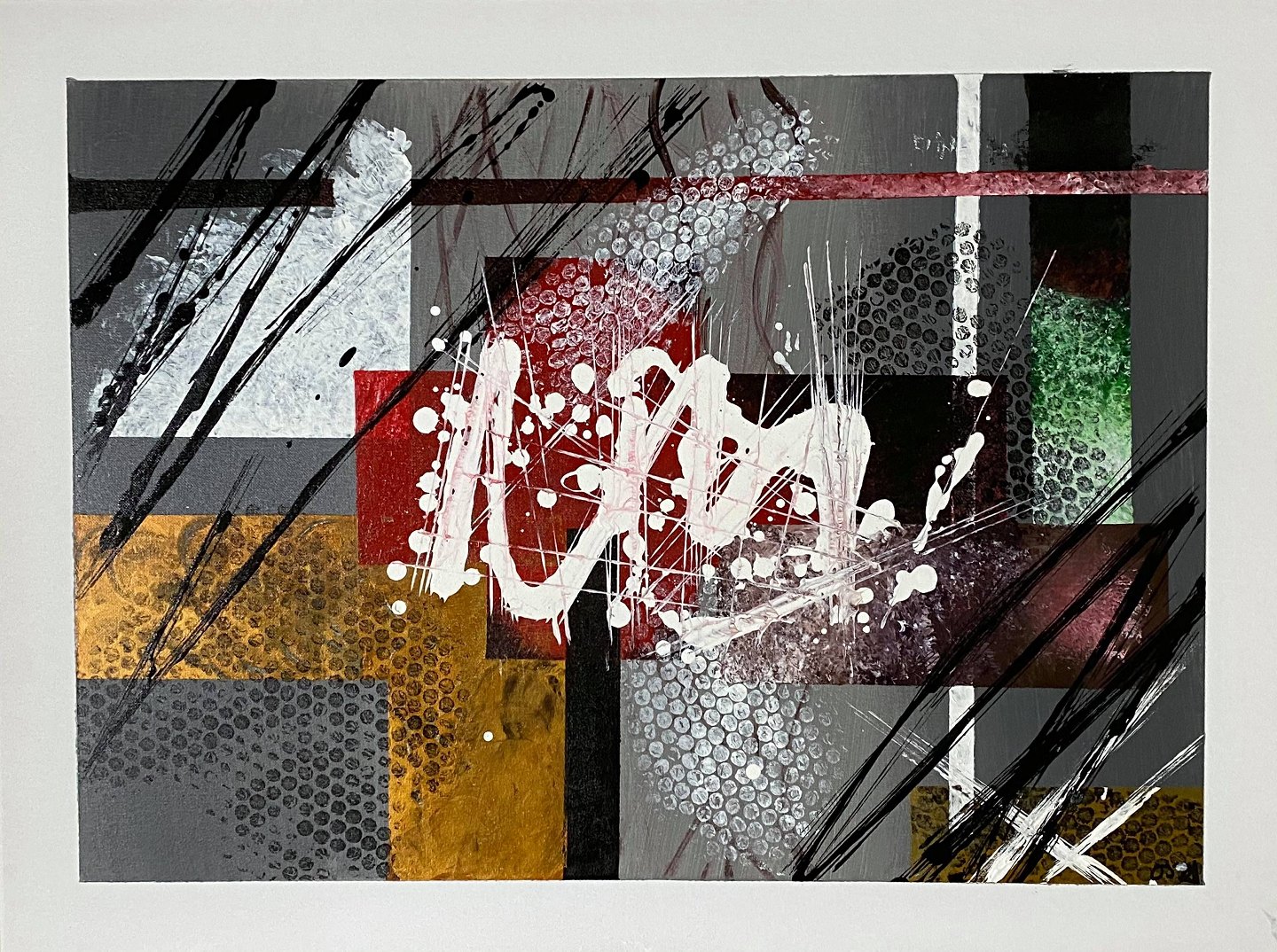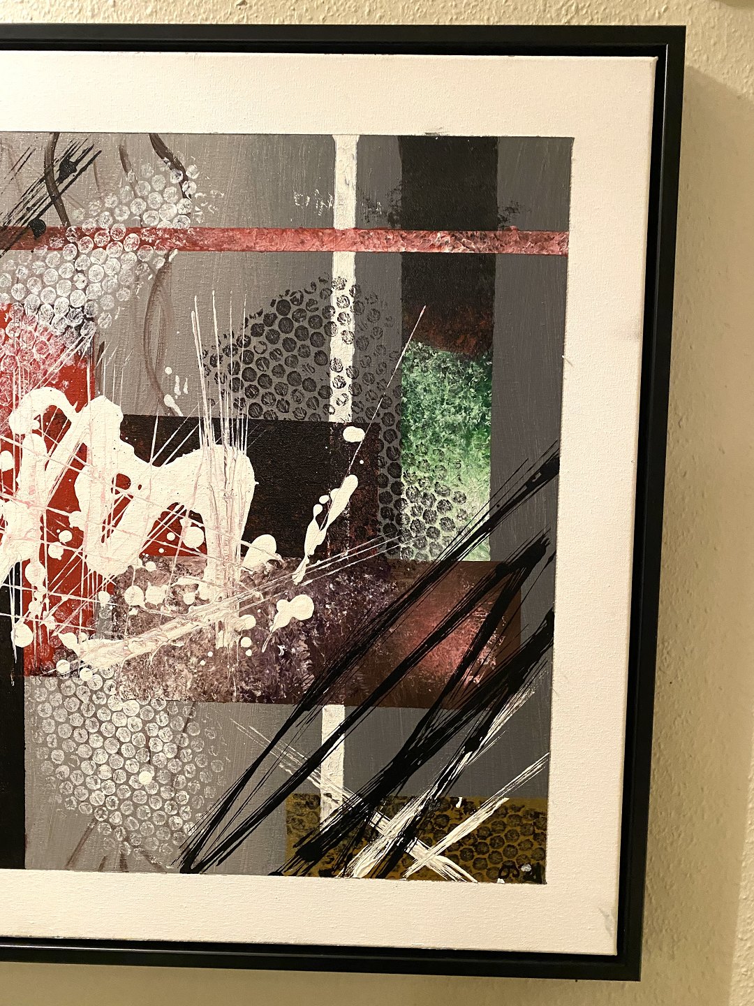 Moderne maleri på lærred med abstrakt motiv signeret O.J. 2021. Maleriet er med sort ramme.