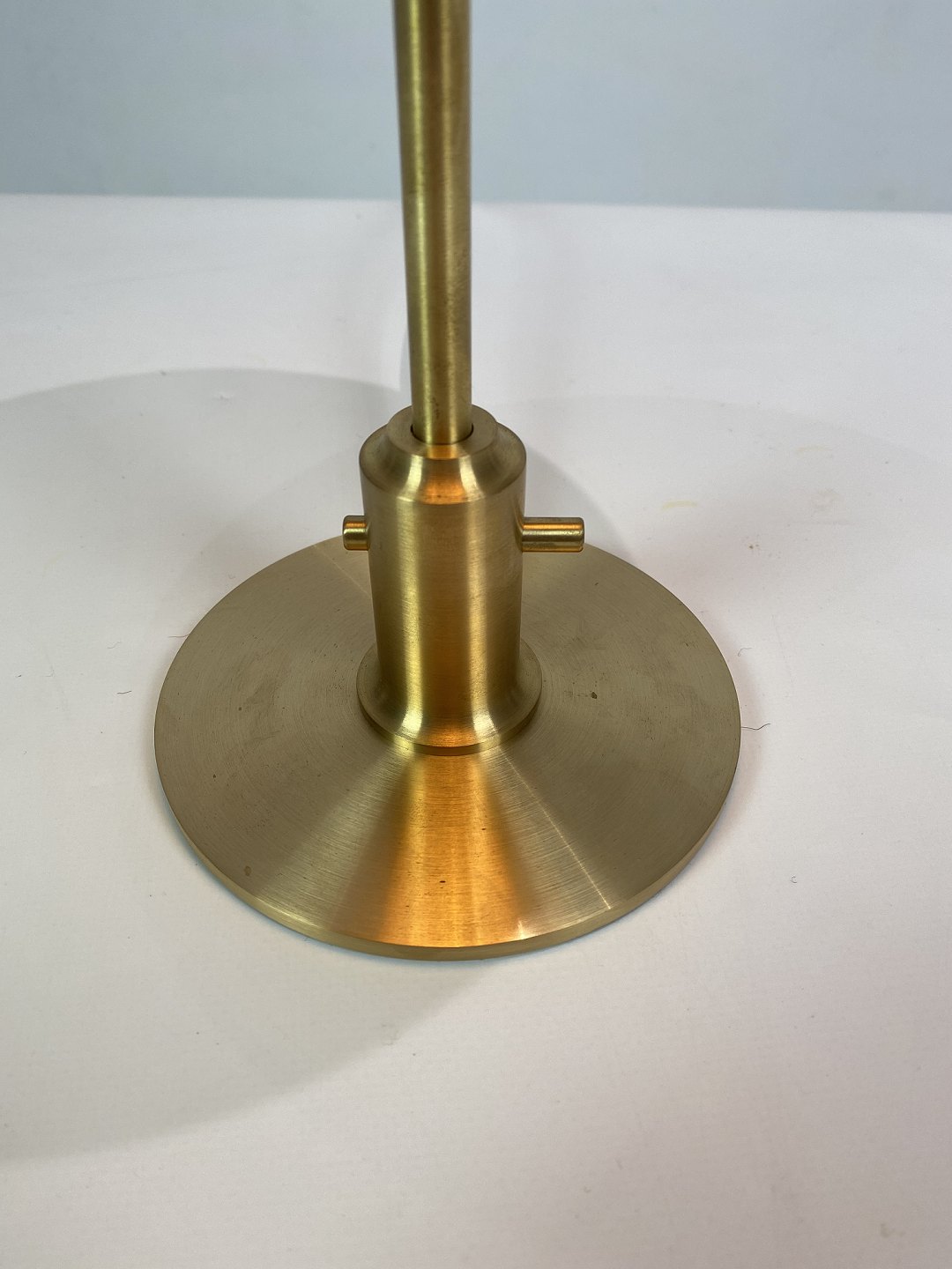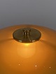 Materiale: Skærme: Mundblæst ravfarvet trelagsglas. Blankt på ydersiden, sandblæst på indersiden. Topplade, fod og stander: Messing, børstet og ubehandlet. Den ubehandlede messing vil ændre sig over tid og udvikle patina. Ledningslængde: 2,8 m. Gennemgående afbryder. Ledning: Brun tekstilledning.