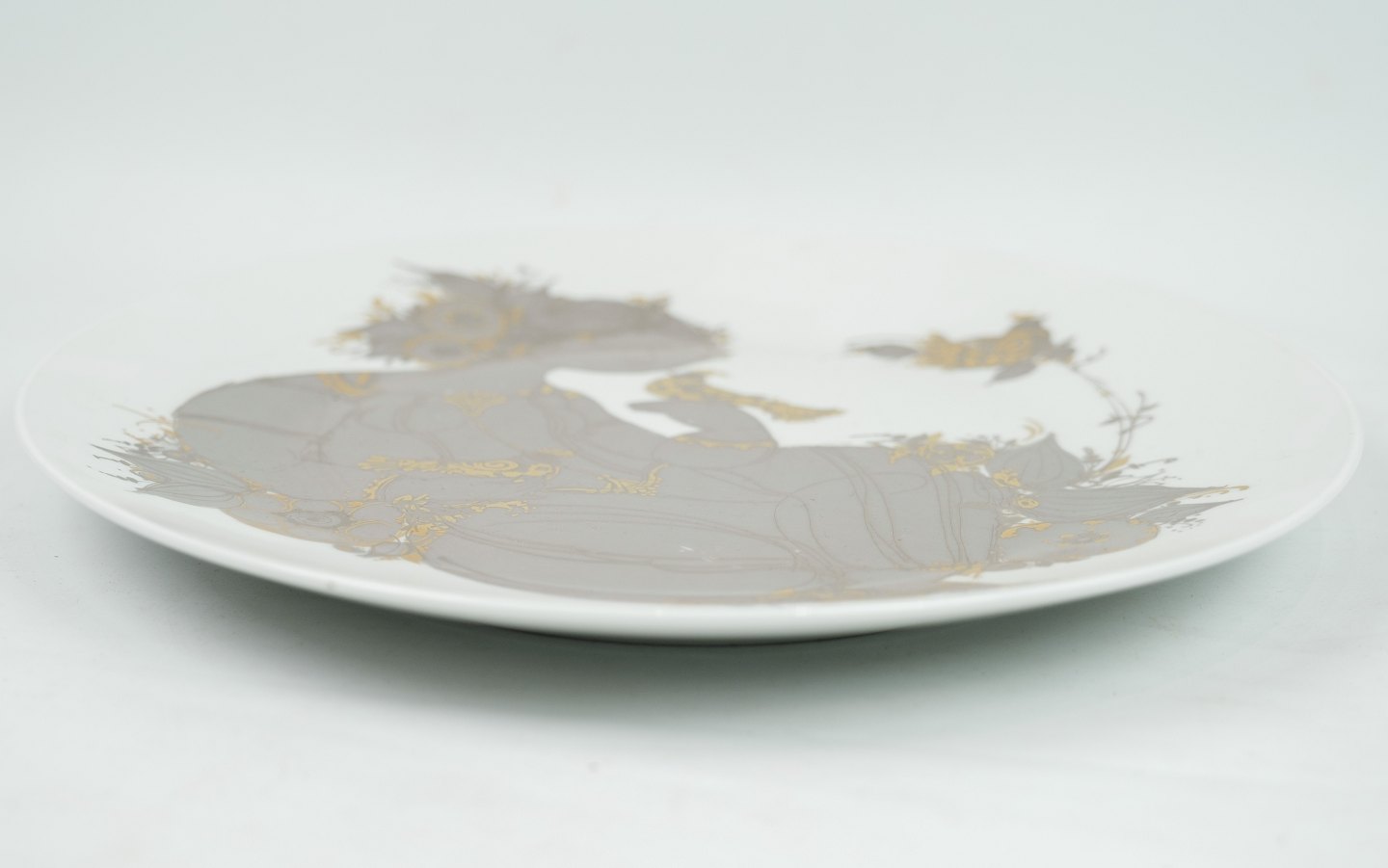 Platte med motiv af dame i guld og grå farver i porcelæn designet Bjørn Winnblad og produceret af rosenthal. Står i meget fin brugt stand.