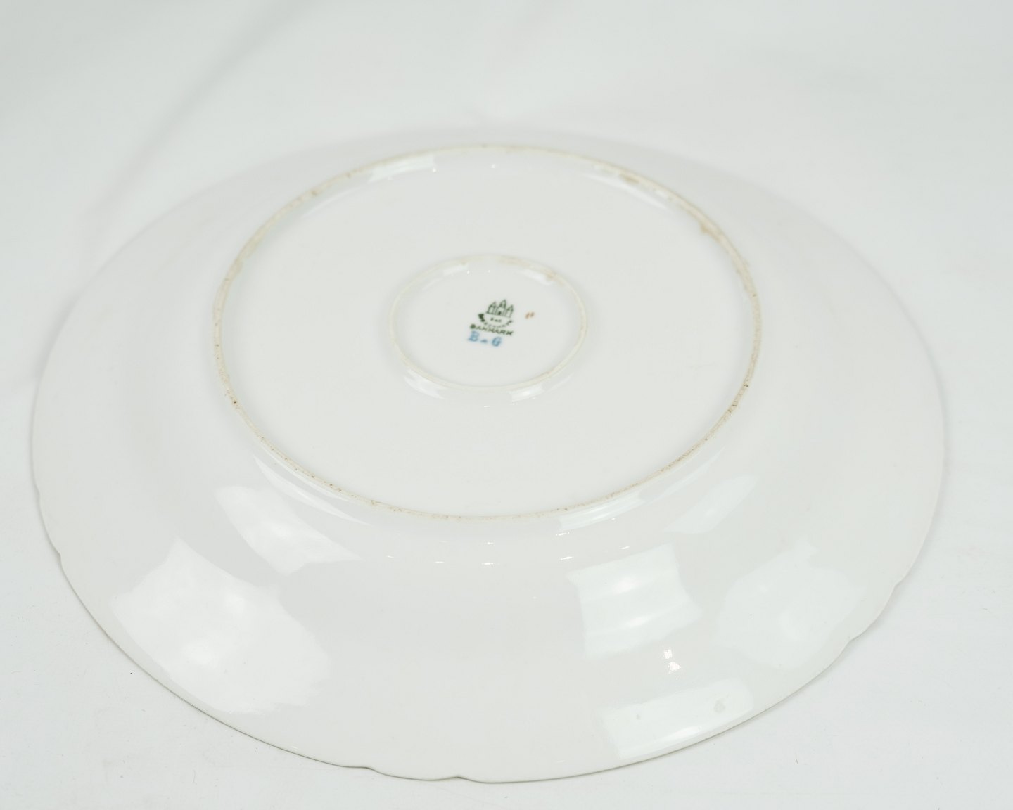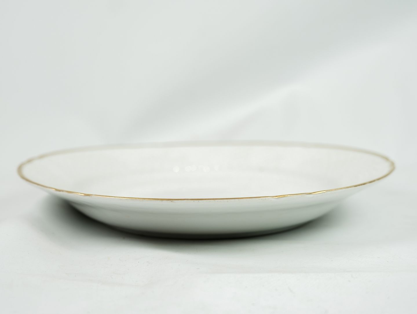 Et rundt fad i Bing & Grøndahl i mønstret Hartmann med en guldkant.