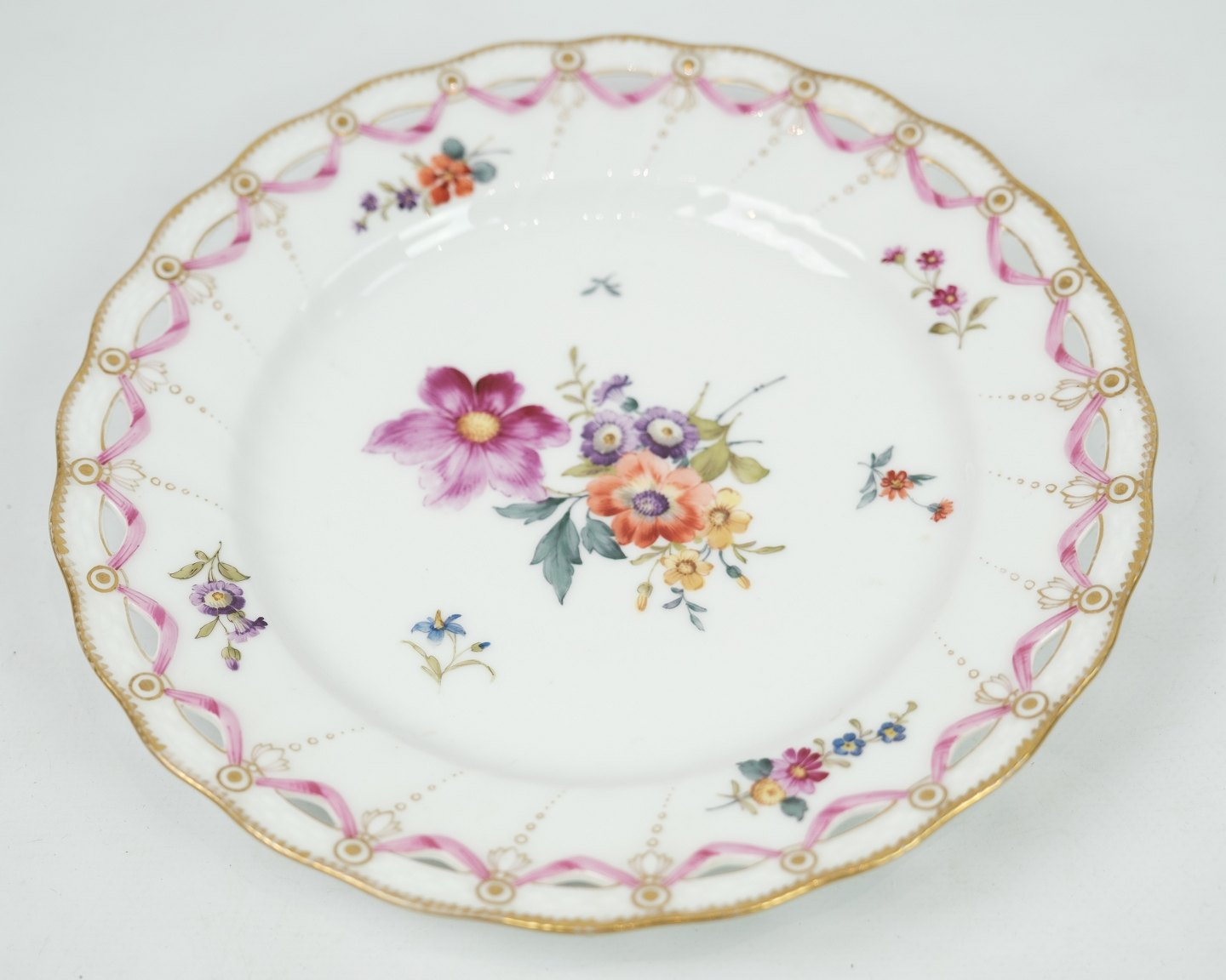 Antique royal plate pierced in patterned Saxon flower with 3 waves. The 3 waves indicate that it is one of the first the royal porcelain factory made in this pattern. Extremely rarely appears whole and without damage