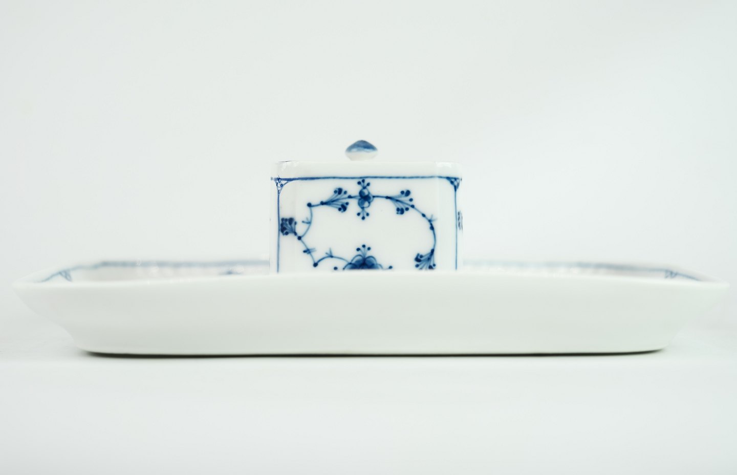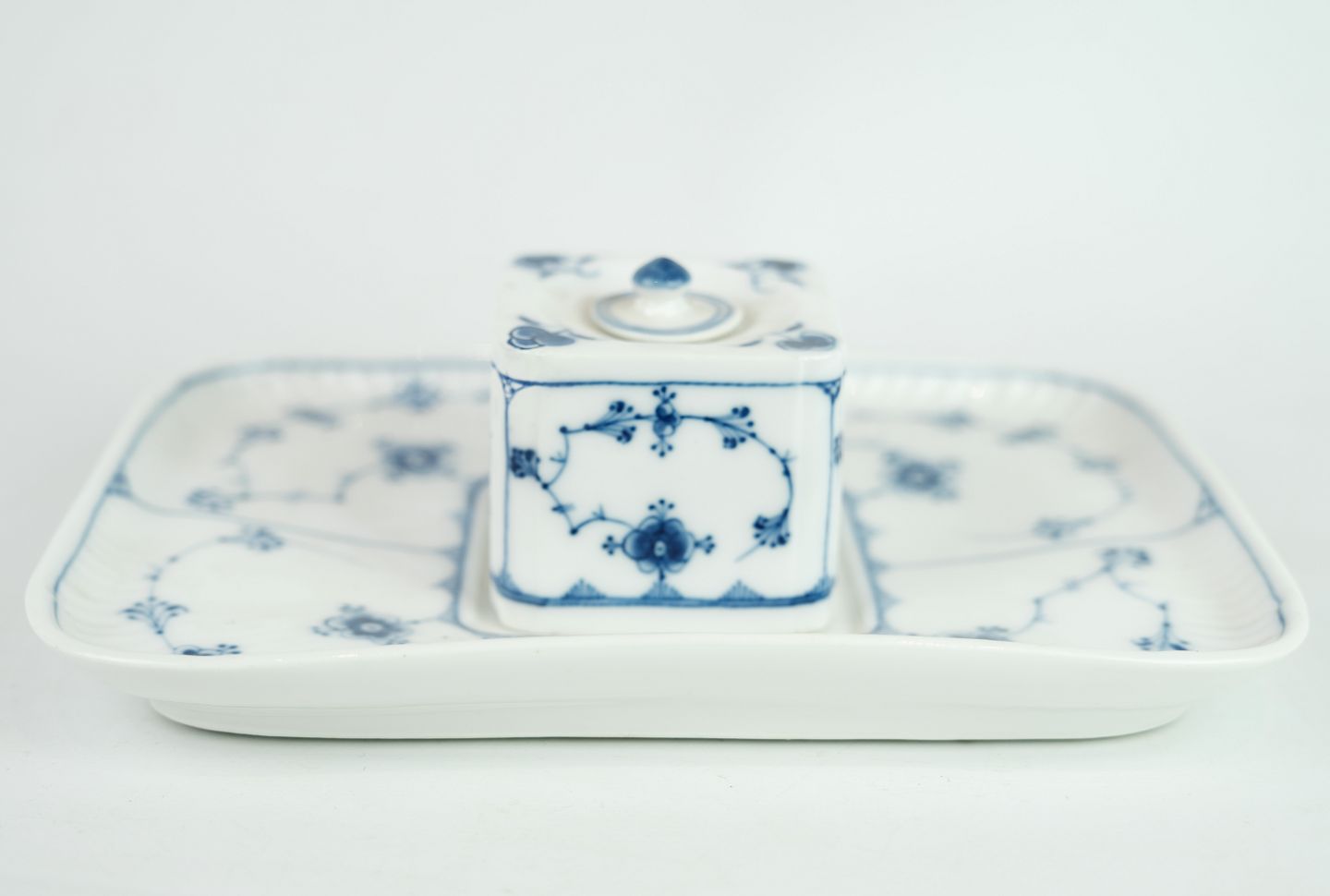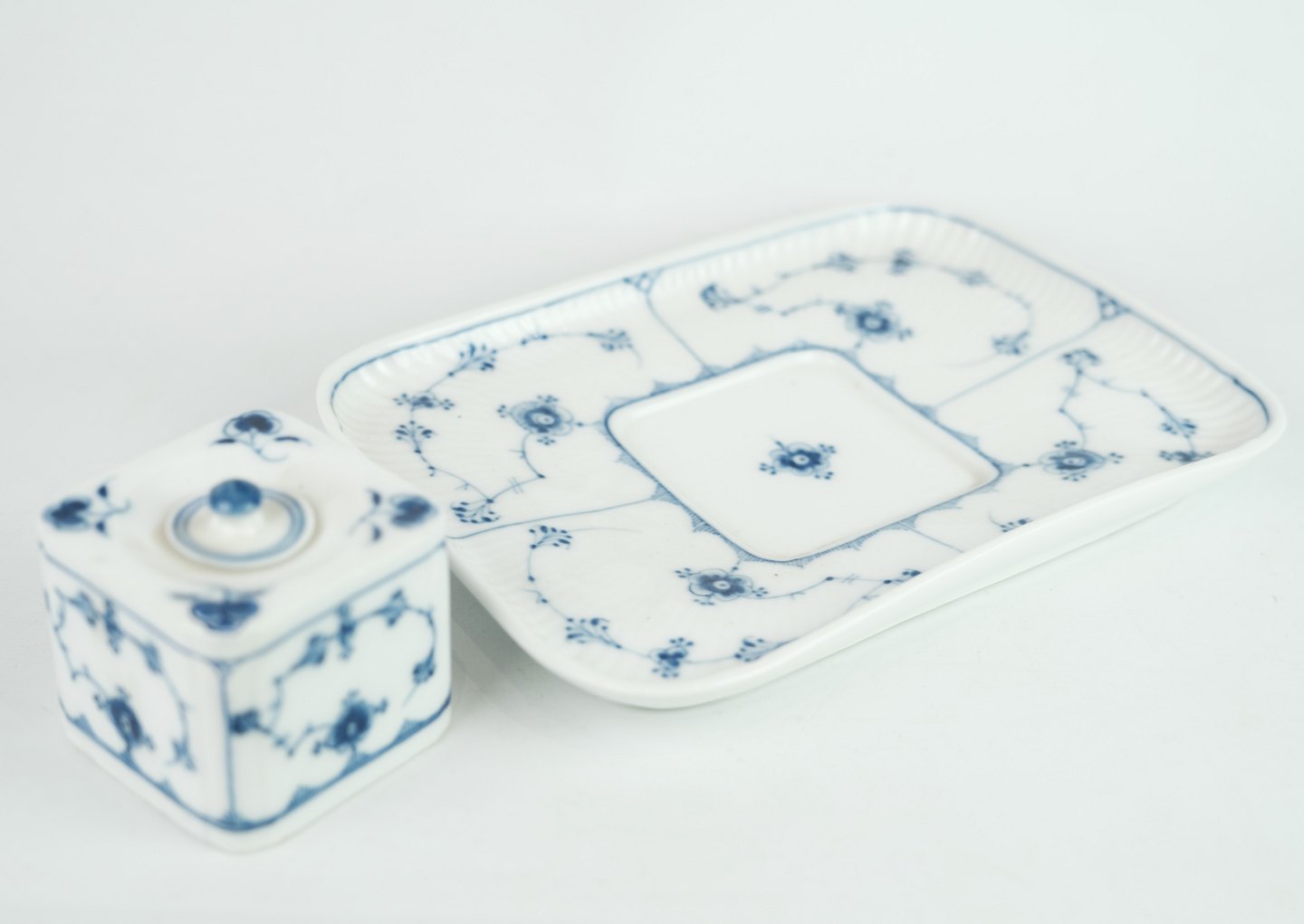 SolgtRoyal Copenhagen kongelig Musselmalet Riflet Bakke / skrivesæt med Blækhus og låg. Nr. 1/128