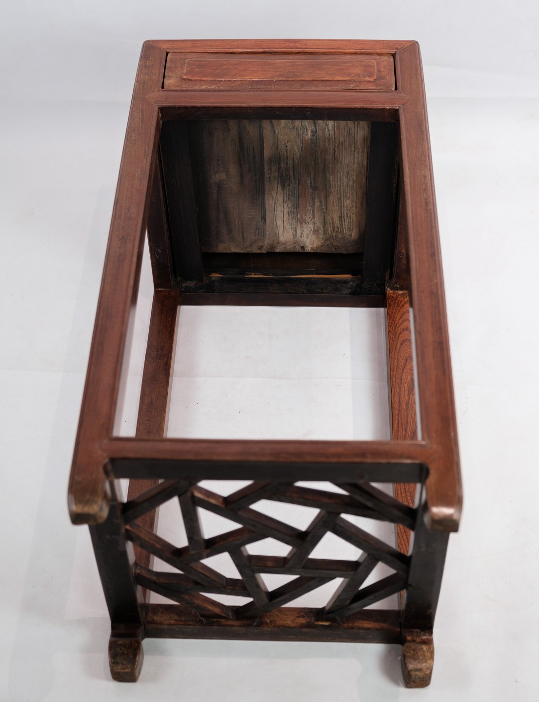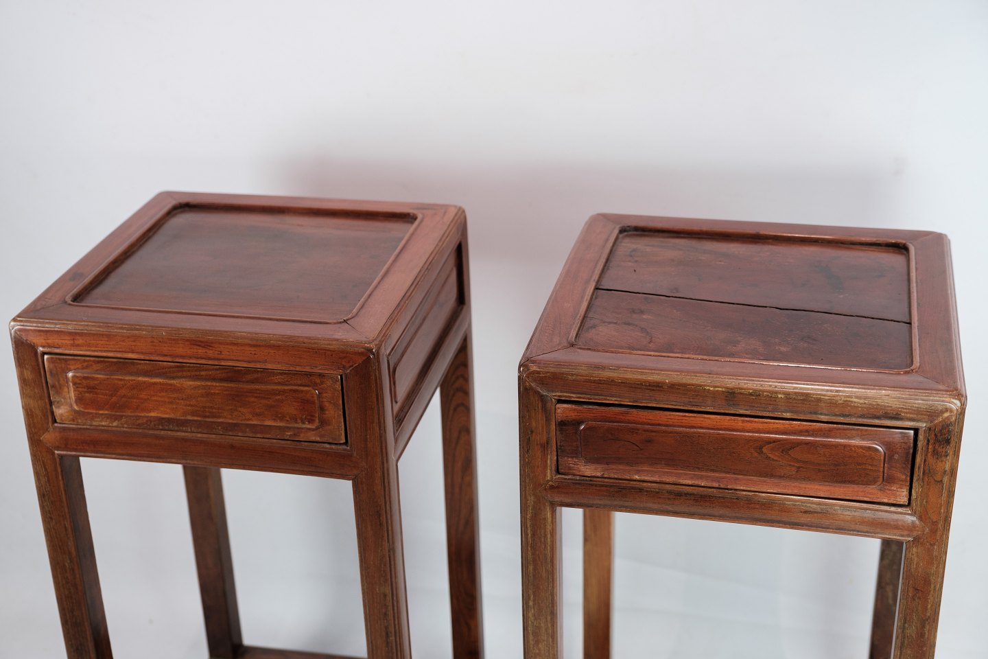 A set of Chinese side tables with drawer in polished dark wood from around the year 1880s. In really good condition.