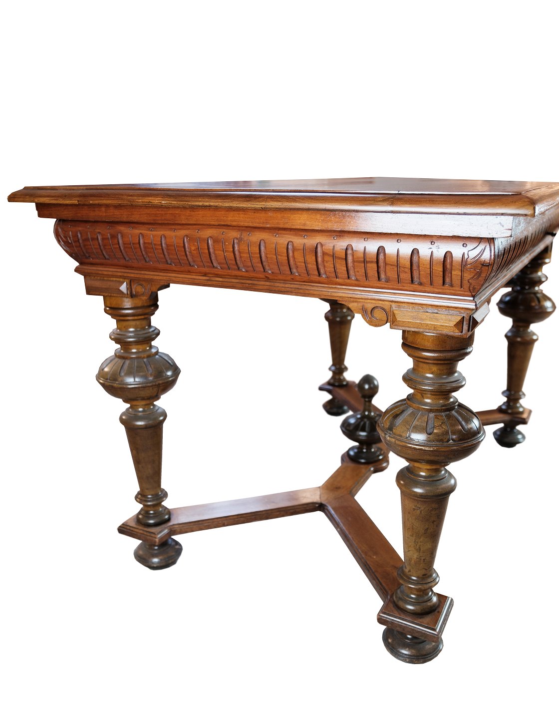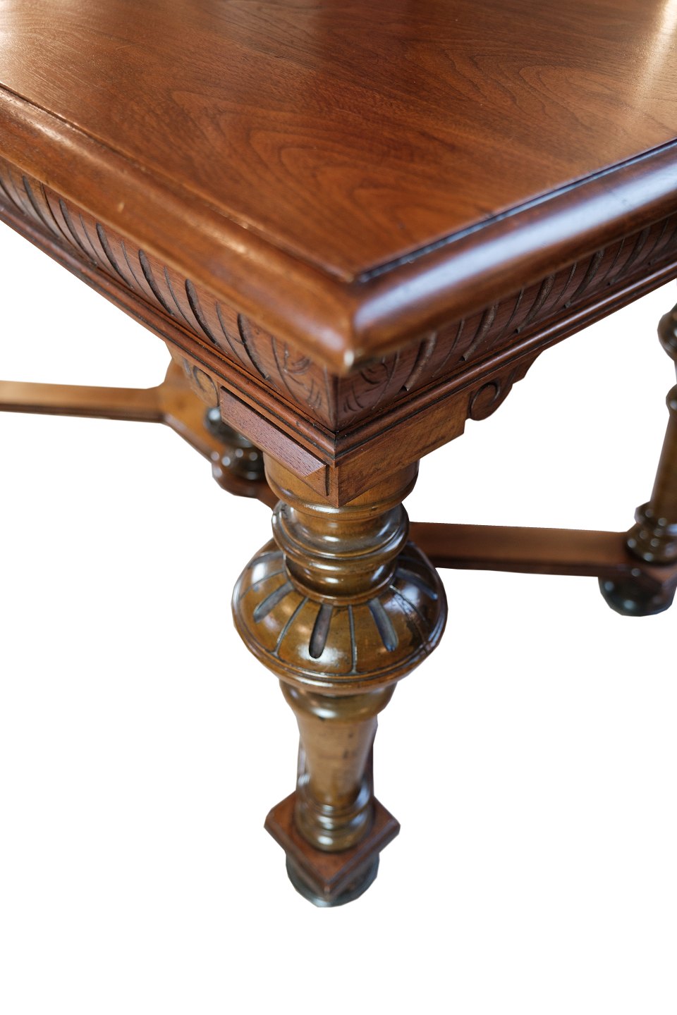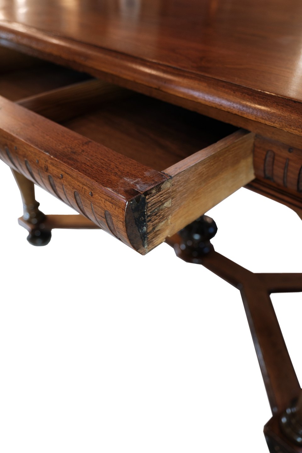 SolgtAnretterbord / skrivebord i valnød fra Danmark dekoreret med udskæringer fra år 1880'erne. Istandsat.