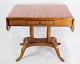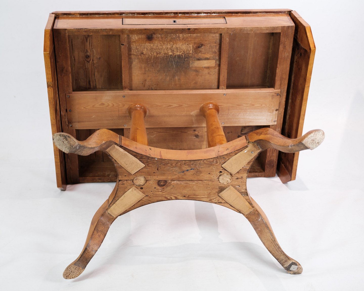The Empire dining table, an antique piece featuring intricate intarsia work, crafted from birch wood and originating from Denmark in 1840, is a remarkable testament to the craftsmanship and grandeur of the Empire era.