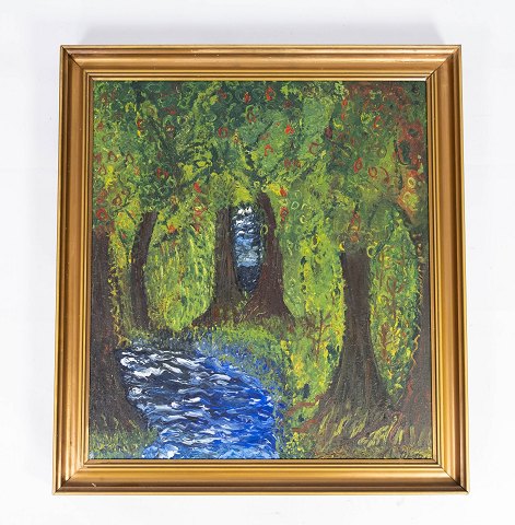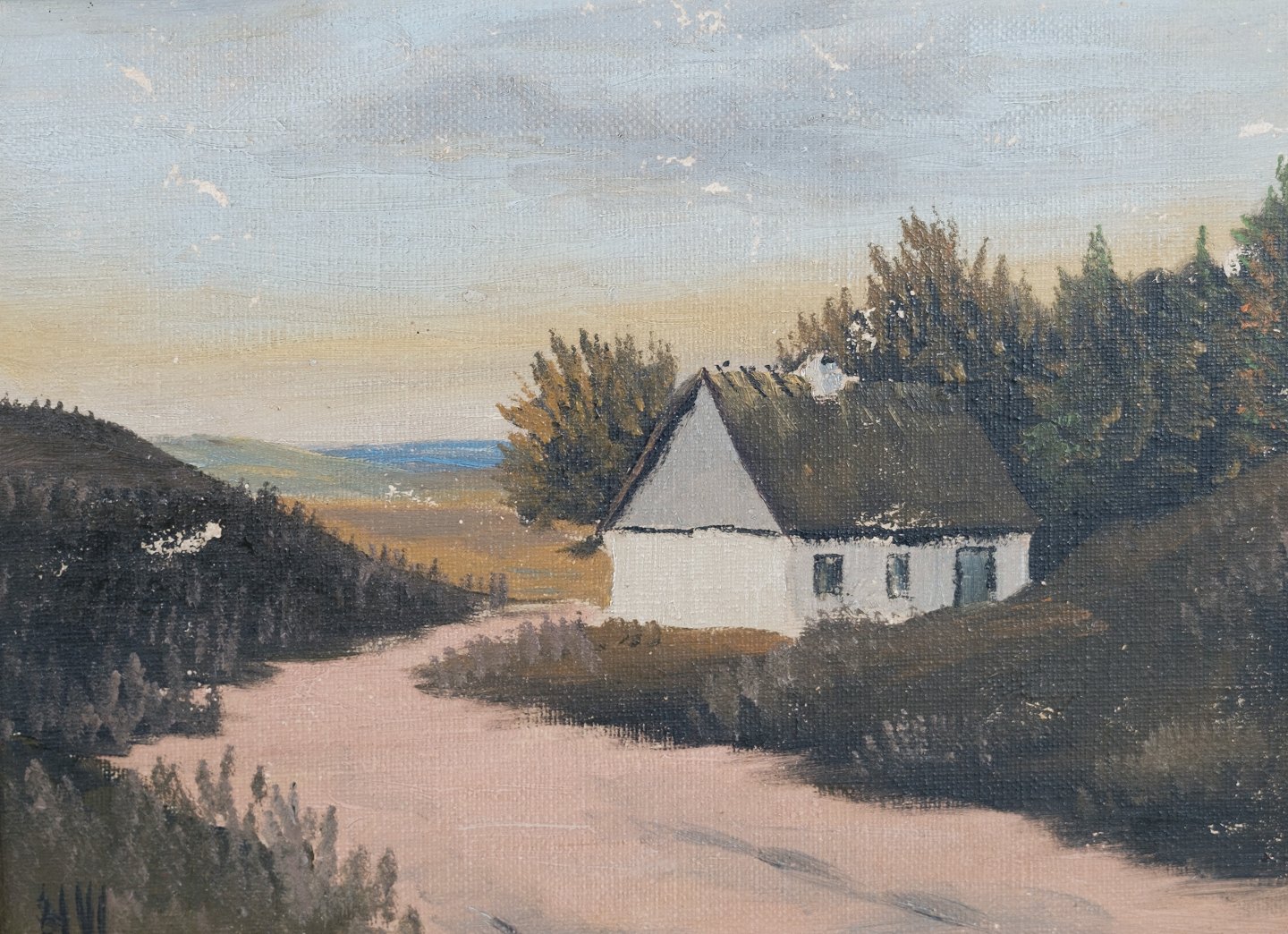 Oil painting of a small farmhouse and gravel road painted on wooden board with gold frame from around the 1940s. In very good used condition.