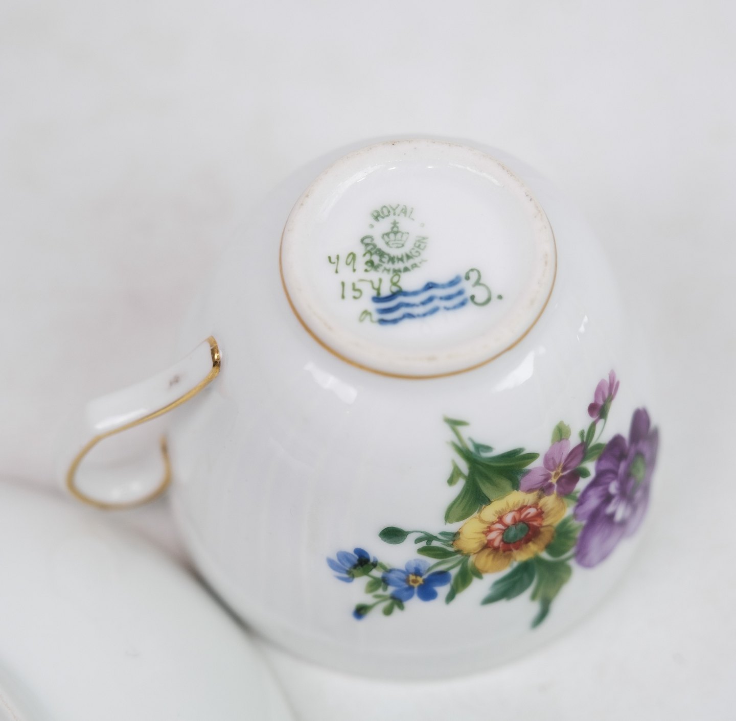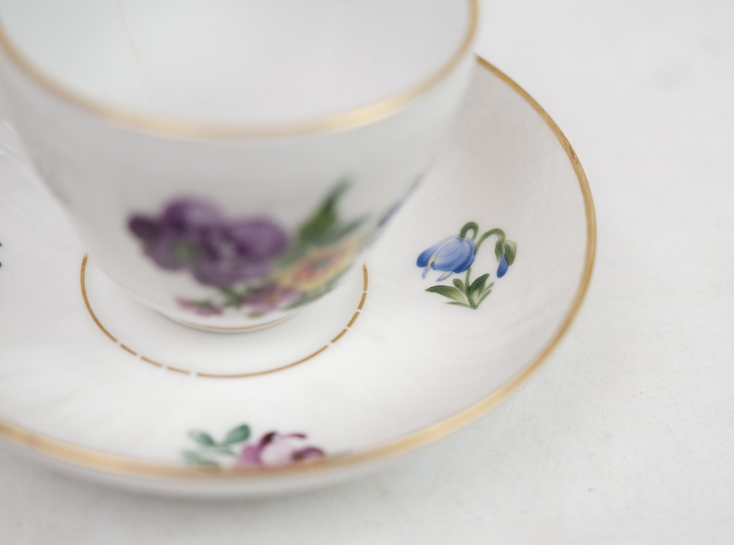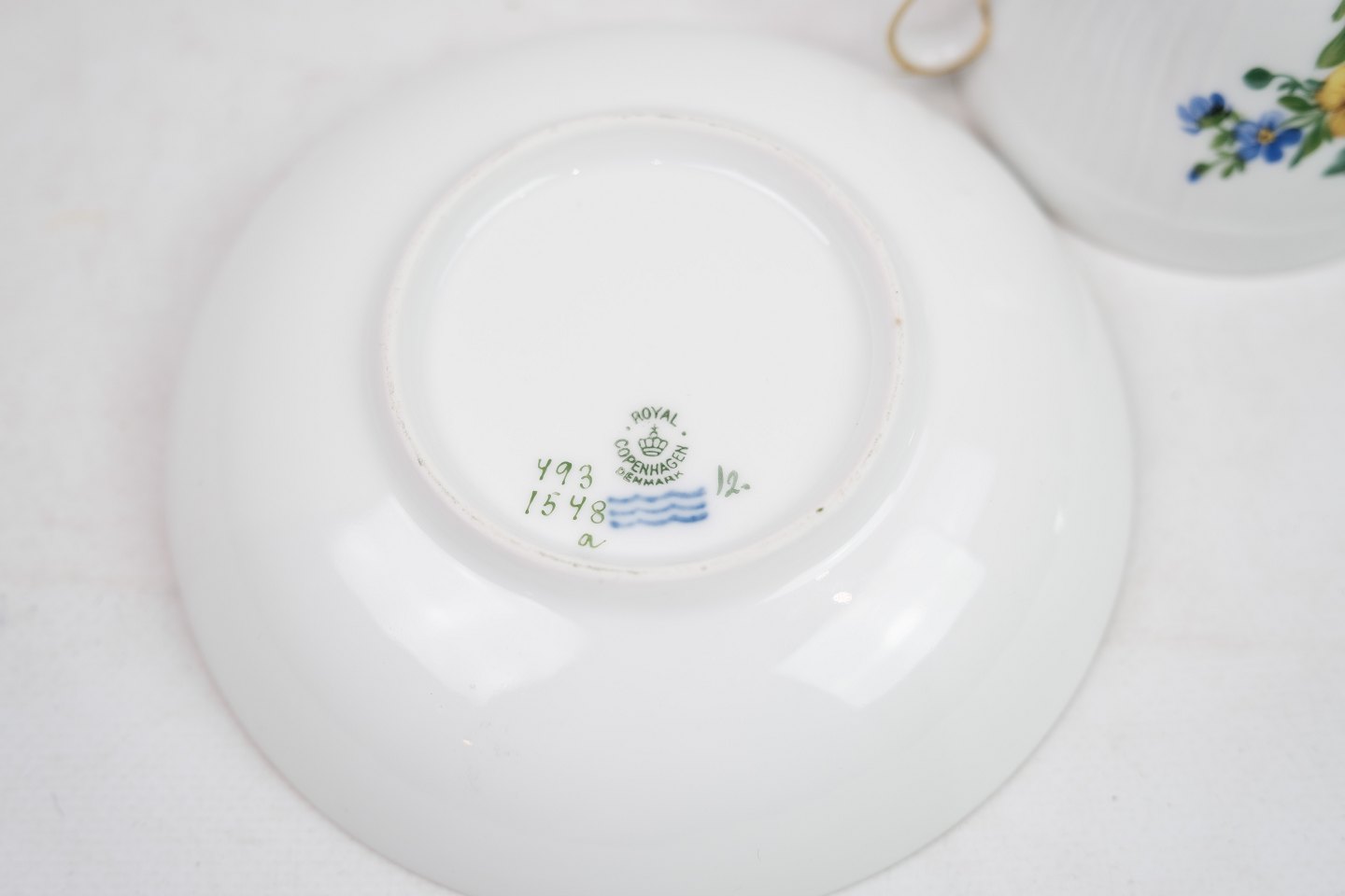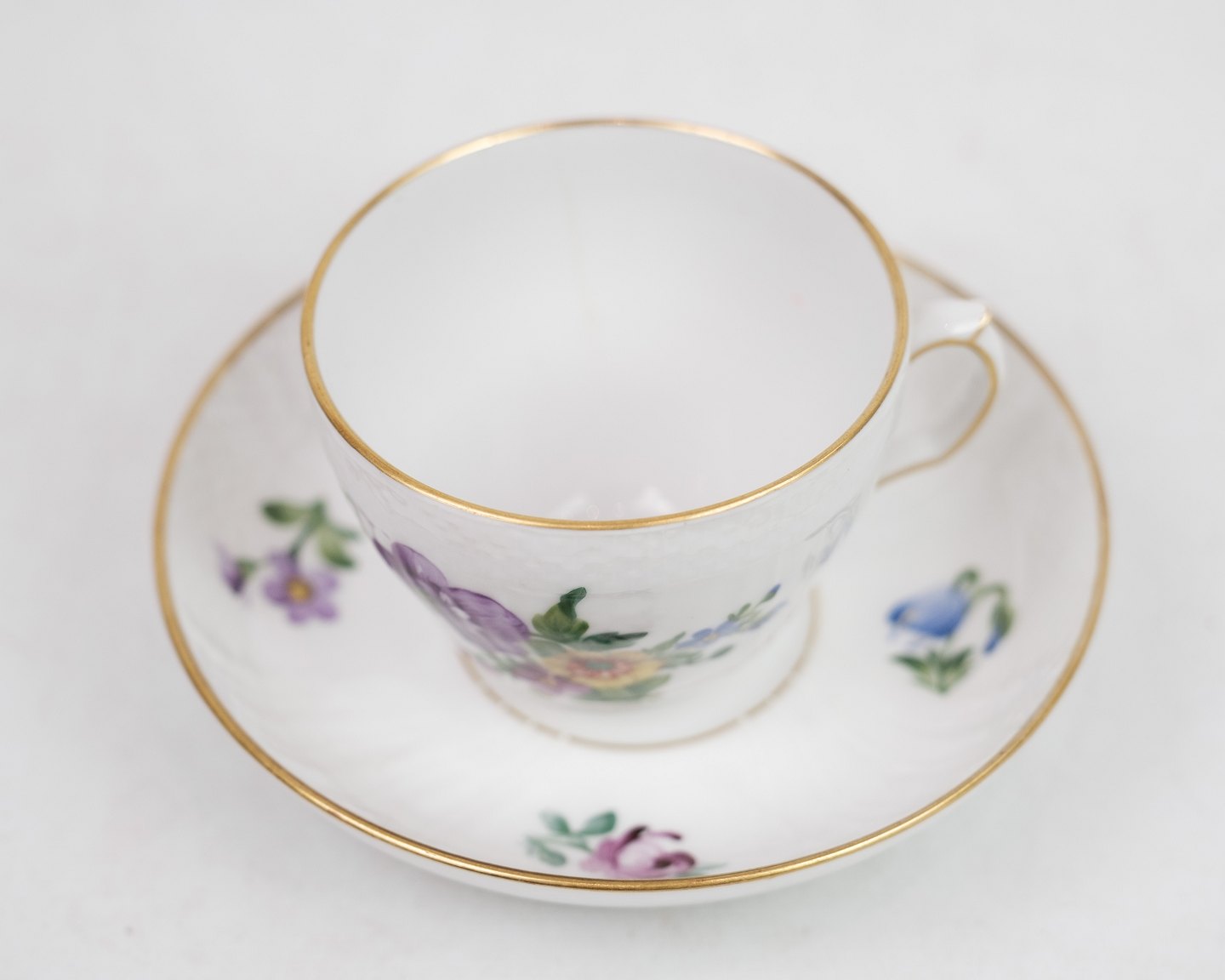 Coffee cup by Royal Copenhagen with saucer in the pattern light Saxon flower no. 493 / 1549. 5000m2 exhibition
