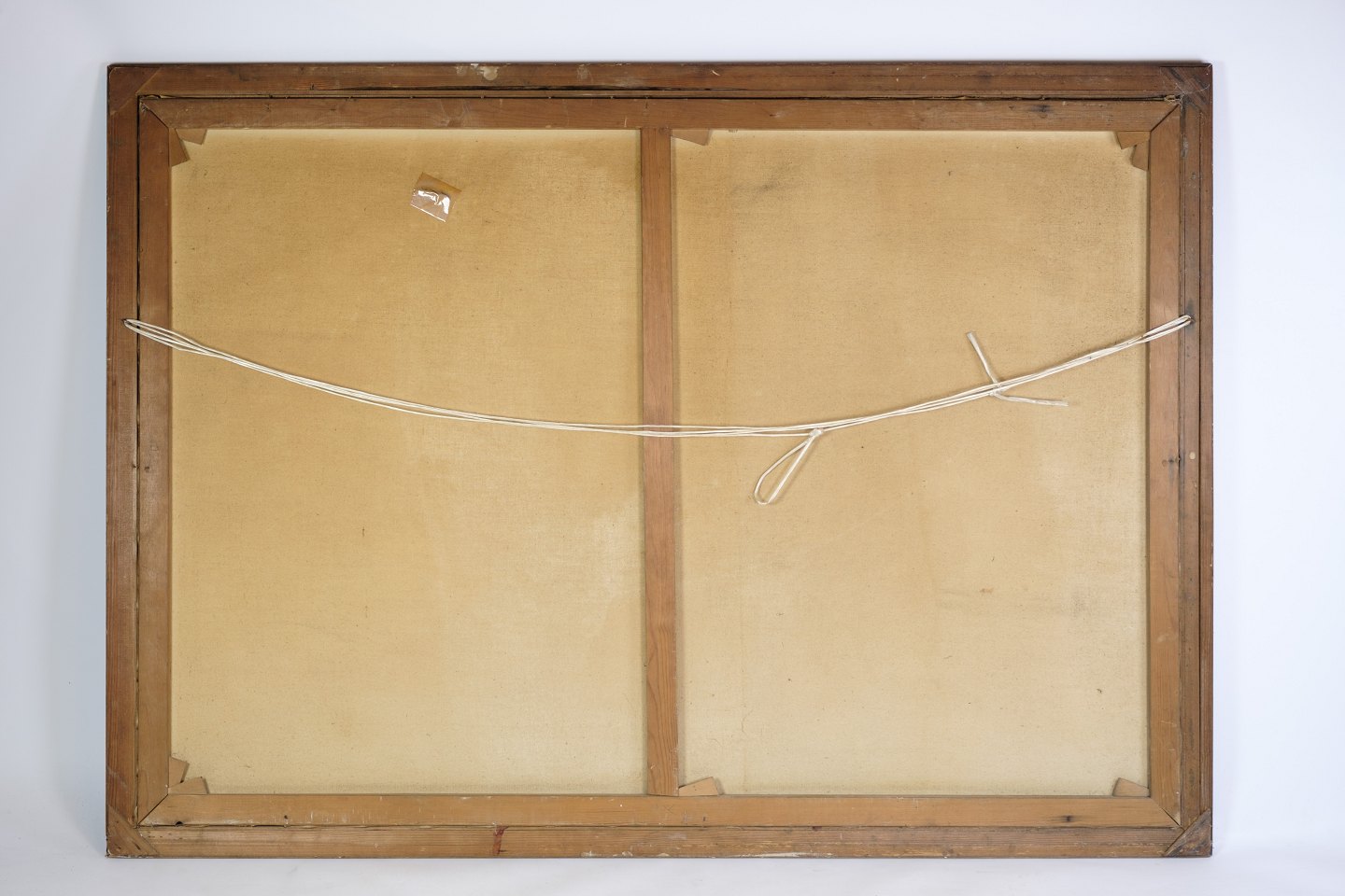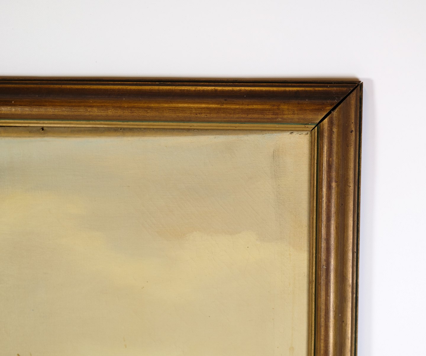 Large oil painting on canvas with motif of two fishermen with a boat and sea from around 1915-1929. Signed
