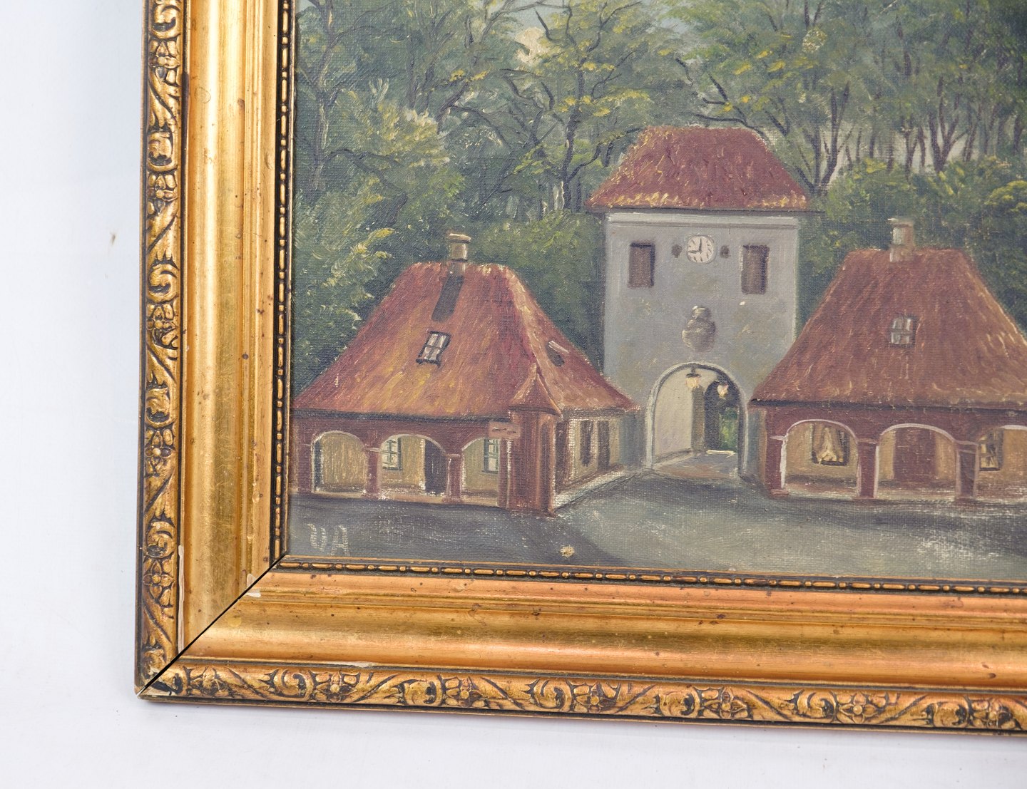 Oliemaleri på lærredet med motiv af bygning og skov med guld ramme fra omkring år 1920'erne.