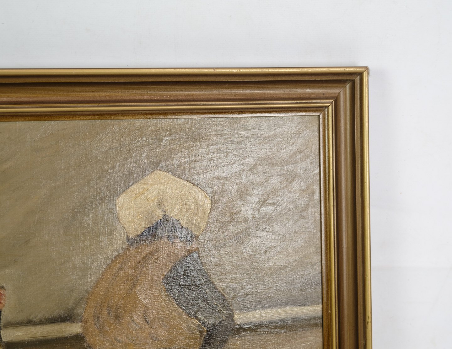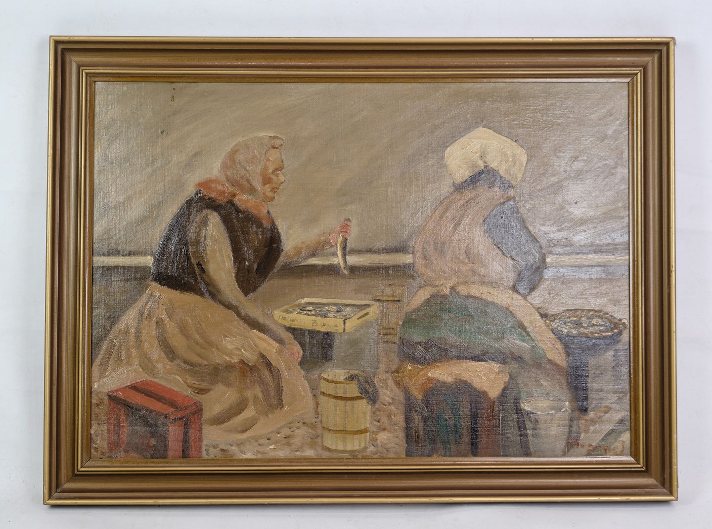 Oil painting painted on wooden plate with motif of fish wives from an old beach in Copenhagen from around the 1930s. Signed