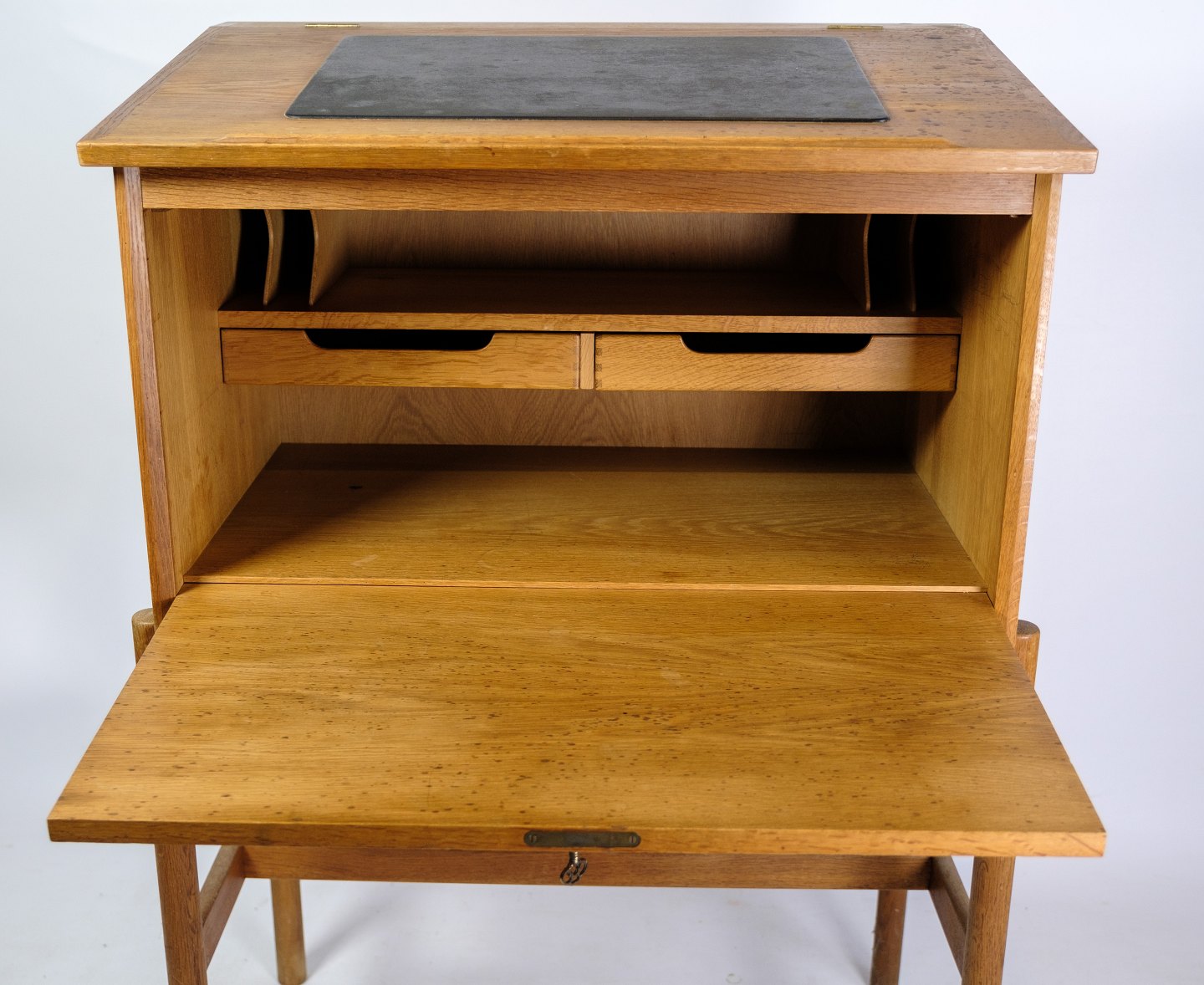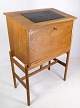 Kontakt os vedrørende prisSkrivepulten, du beskriver, er designet af Rosengran Hansen og fremstillet hos Brande Møbelindustri i omkring 1960'erne. Den er lavet af egetræ og leveres med en original nøgle.
