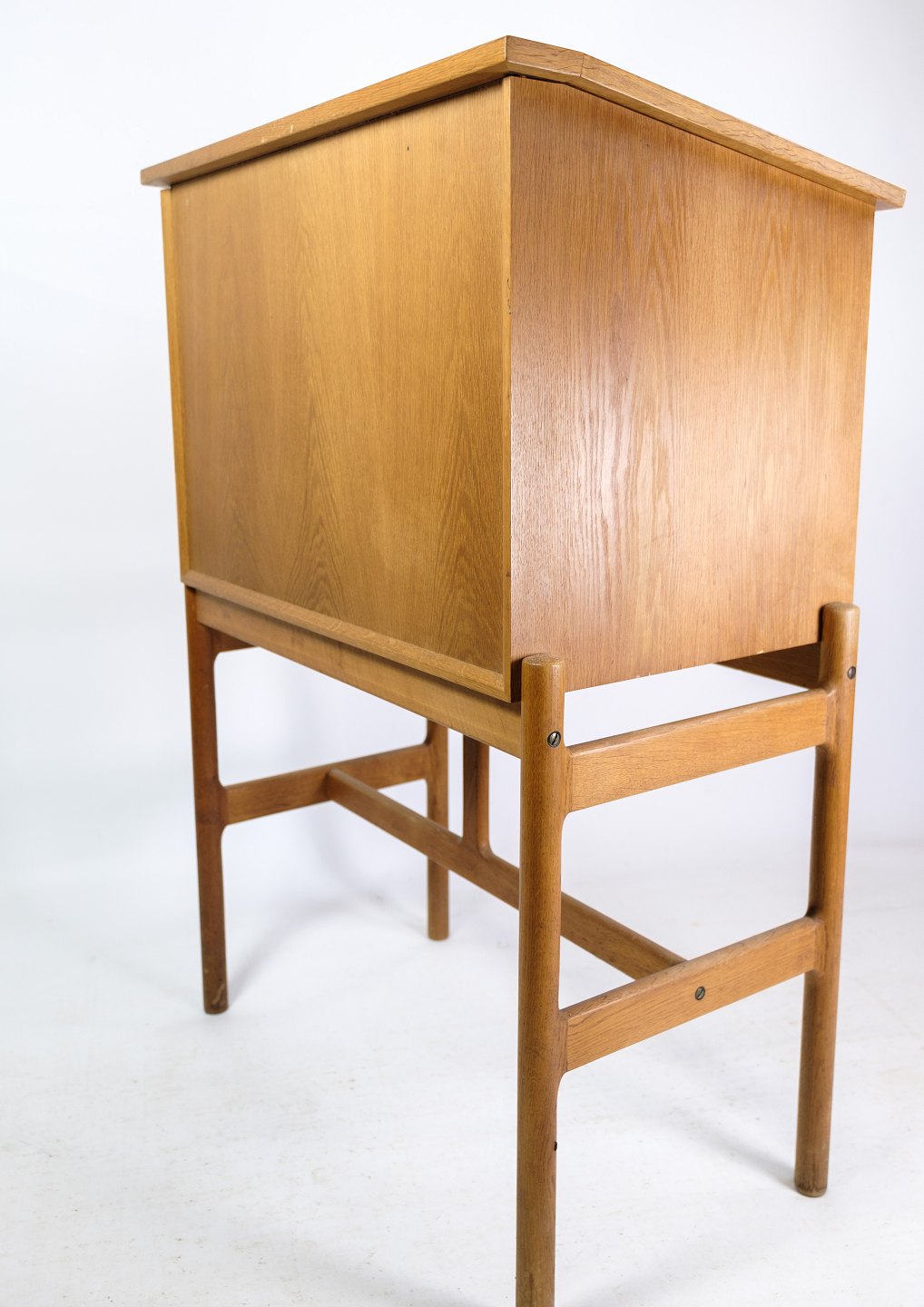 Skrivepulten er et godt eksempel på dansk møbeldesign fra 1960'erne, hvor funktionalitet og enkelhed var i fokus. Designet er slankt og elegant, og den enkle linjeføring giver et moderne udtryk. Den medfølgende nøgle tilføjer en ekstra sikkerhedsfunktion og et strejf af vintage-charme.