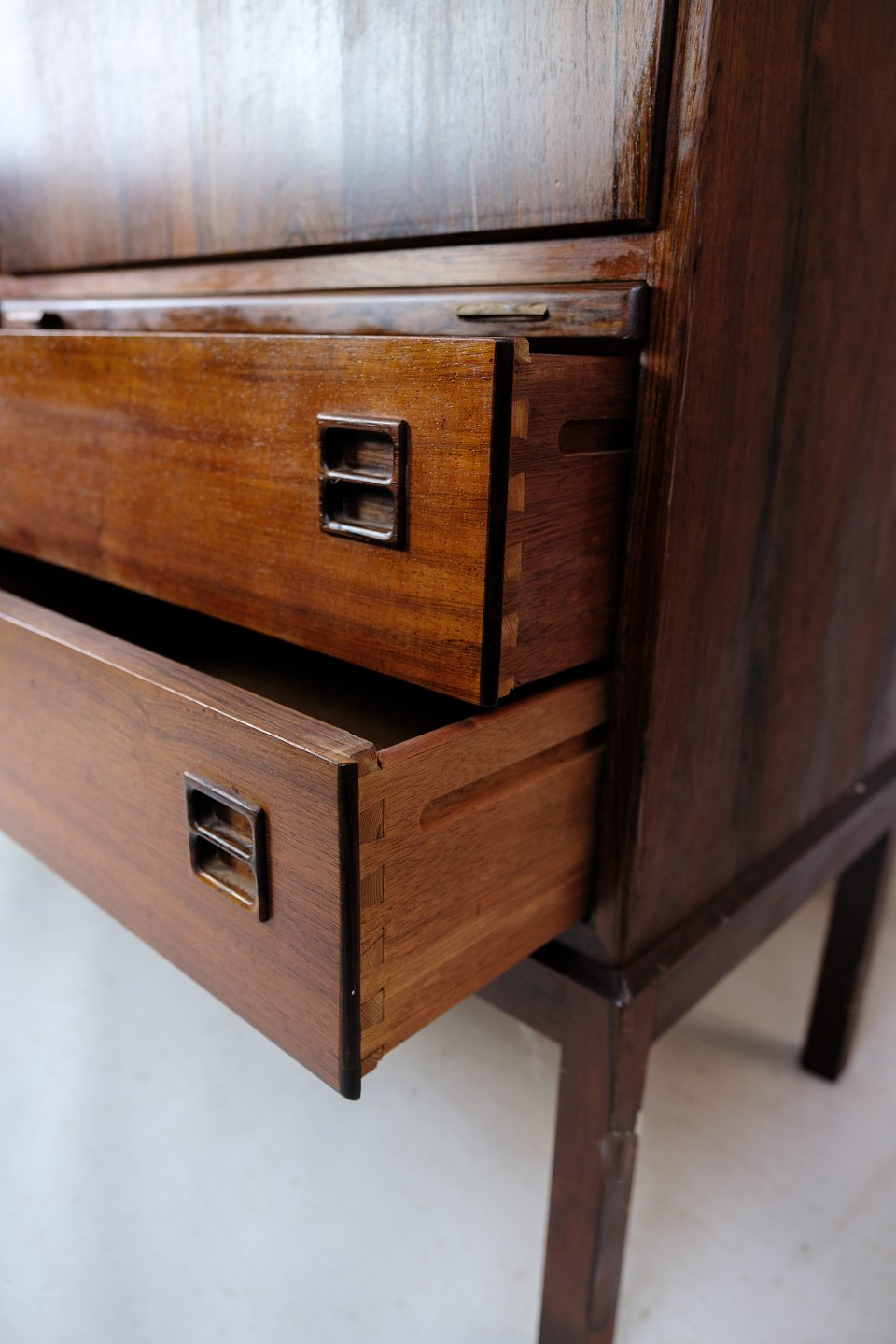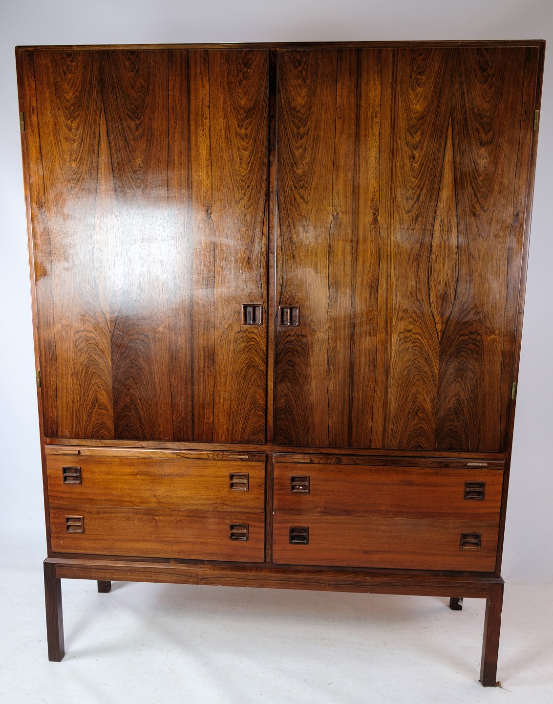 Dette skab, designet af Johannes Andersen og fremstillet af Bernhard Pedersen & Søn i Danmark i 1964, repræsenterer det bedste inden for dansk møbelhåndværk fra midten af det 20. århundrede.
