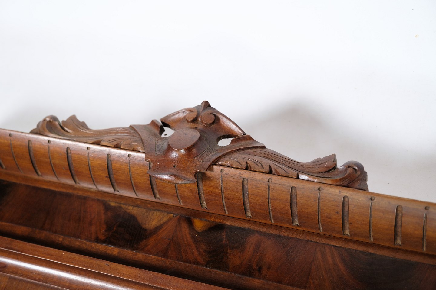 Spejl af hånd poleret mahogni, med udskæringer, lavet i Danmark fra omkring 1880'erne