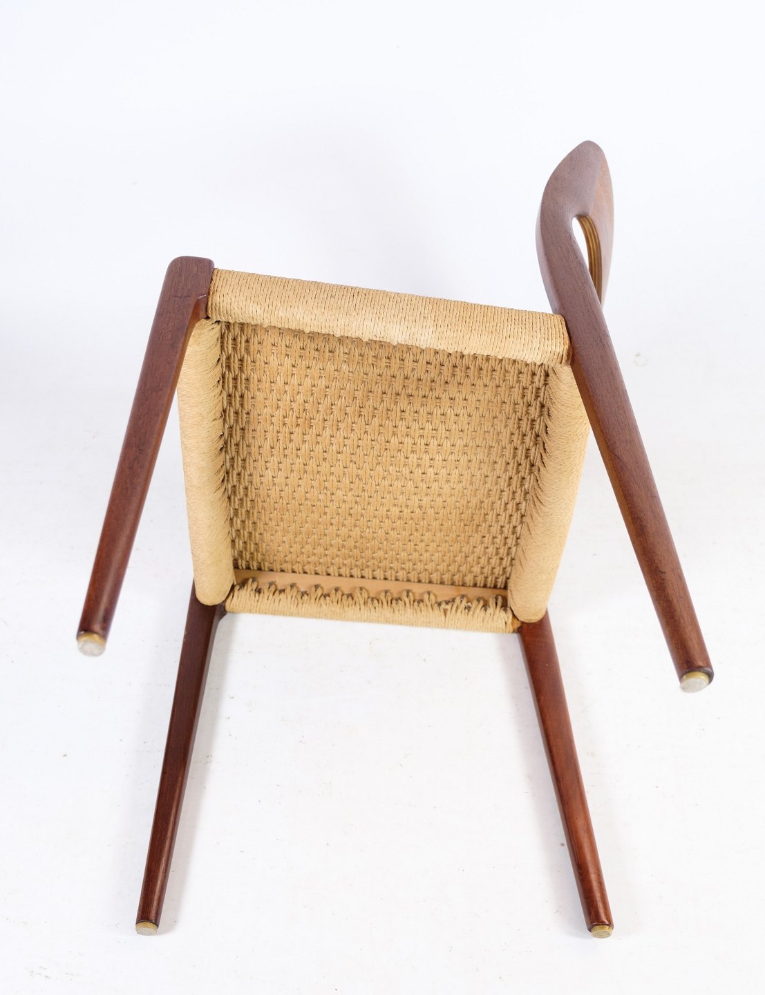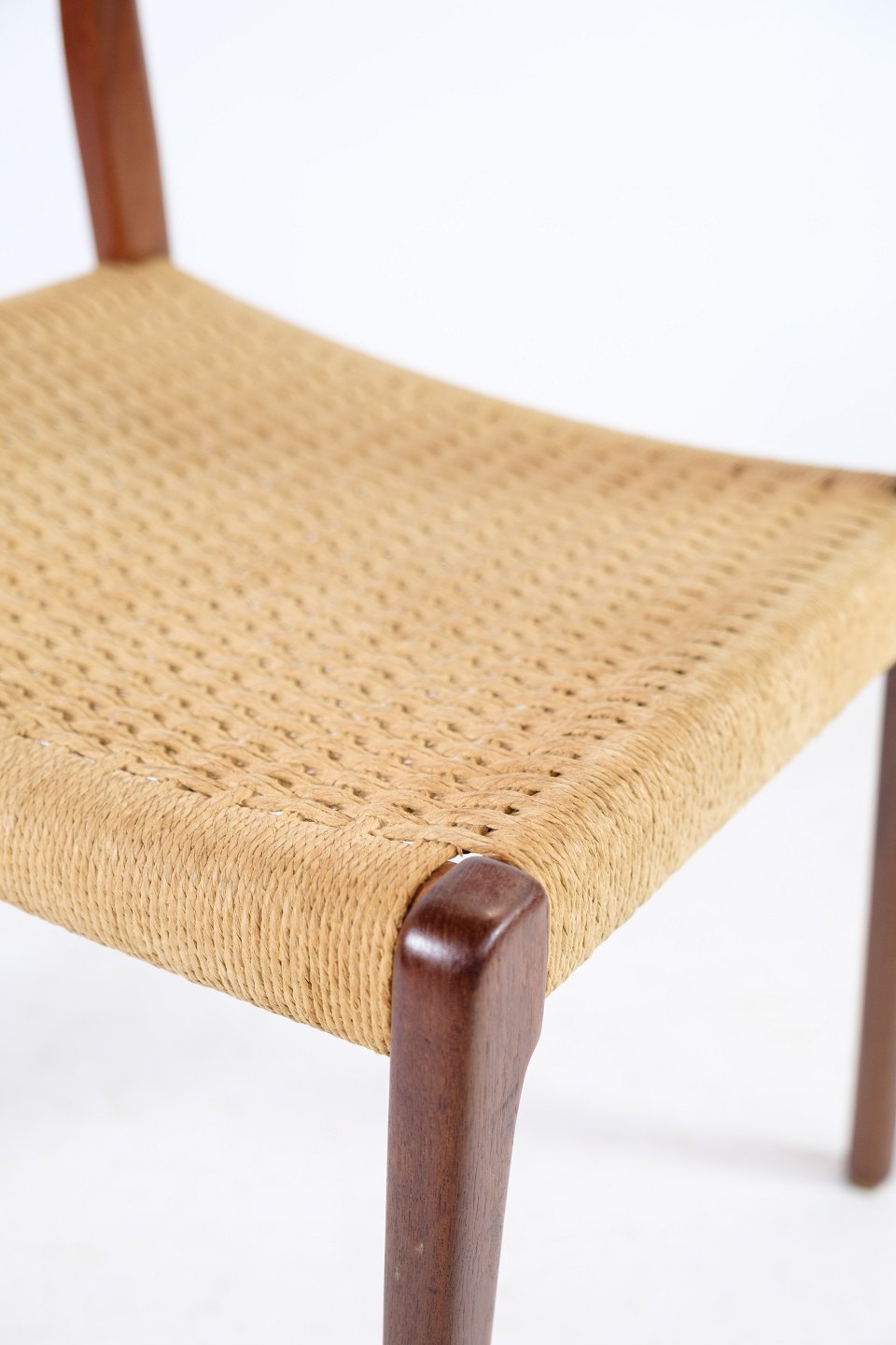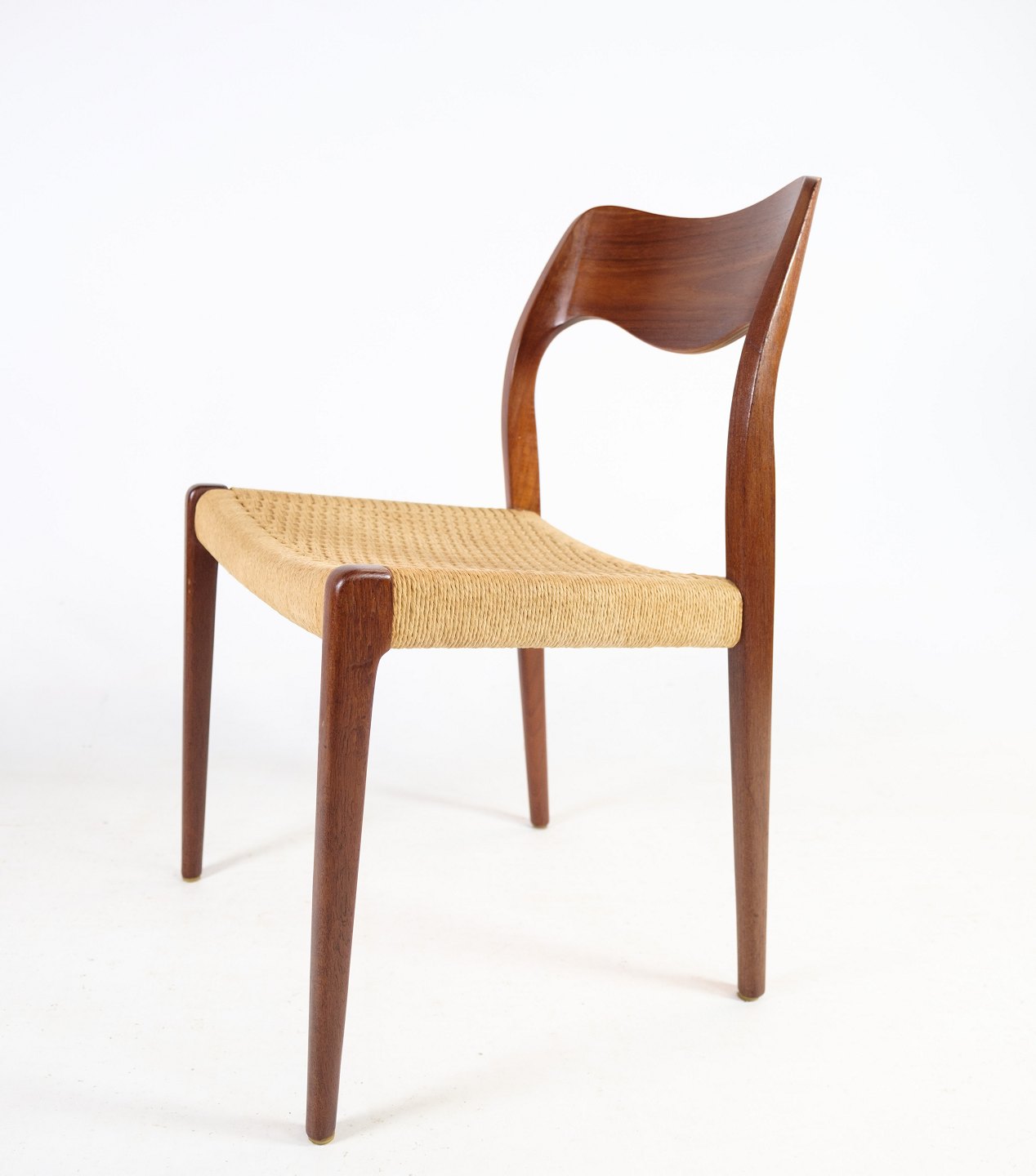 Sæt på 4 spisestuestole, model 71, designet af N.O Møller formgivet i 1951. Står med meget fint stel af teak, samt sæde af flet. Fremstillet hos J.L. Møllers Møbelfabrik.