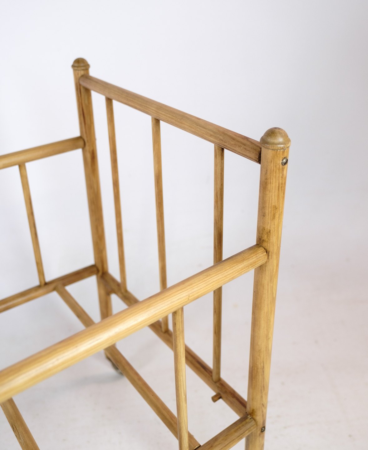 Antik barneseng i lyst fyrretræ med hjul fra omkring år 1920'erne.