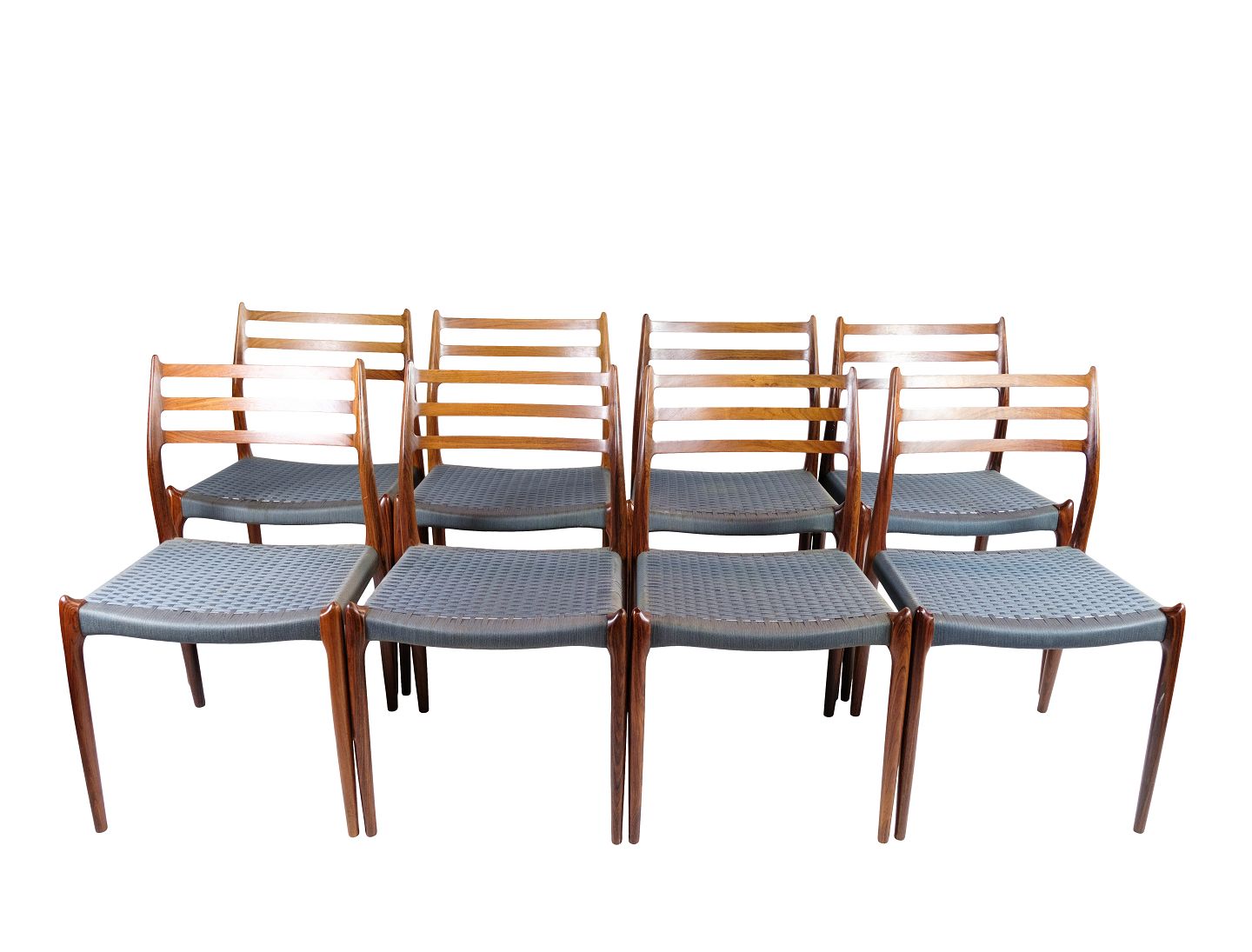 Set of 8 dining room chairs, model NO 78, designed by N.O Møller and manufactured by J. L. Møller Møbelfabrik from around the 1960s. The chairs are in rosewood with blue wicker. In our own workshop we can braid the chairs or cover with leather for an extra price. Write an email to us and we will find out together. Info@osted-antik.dk