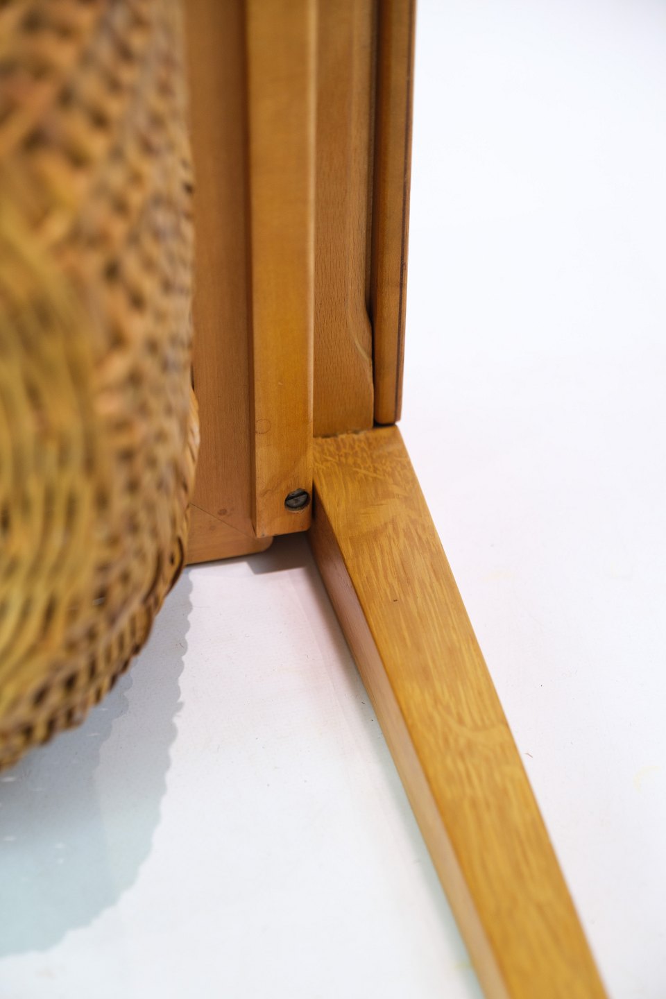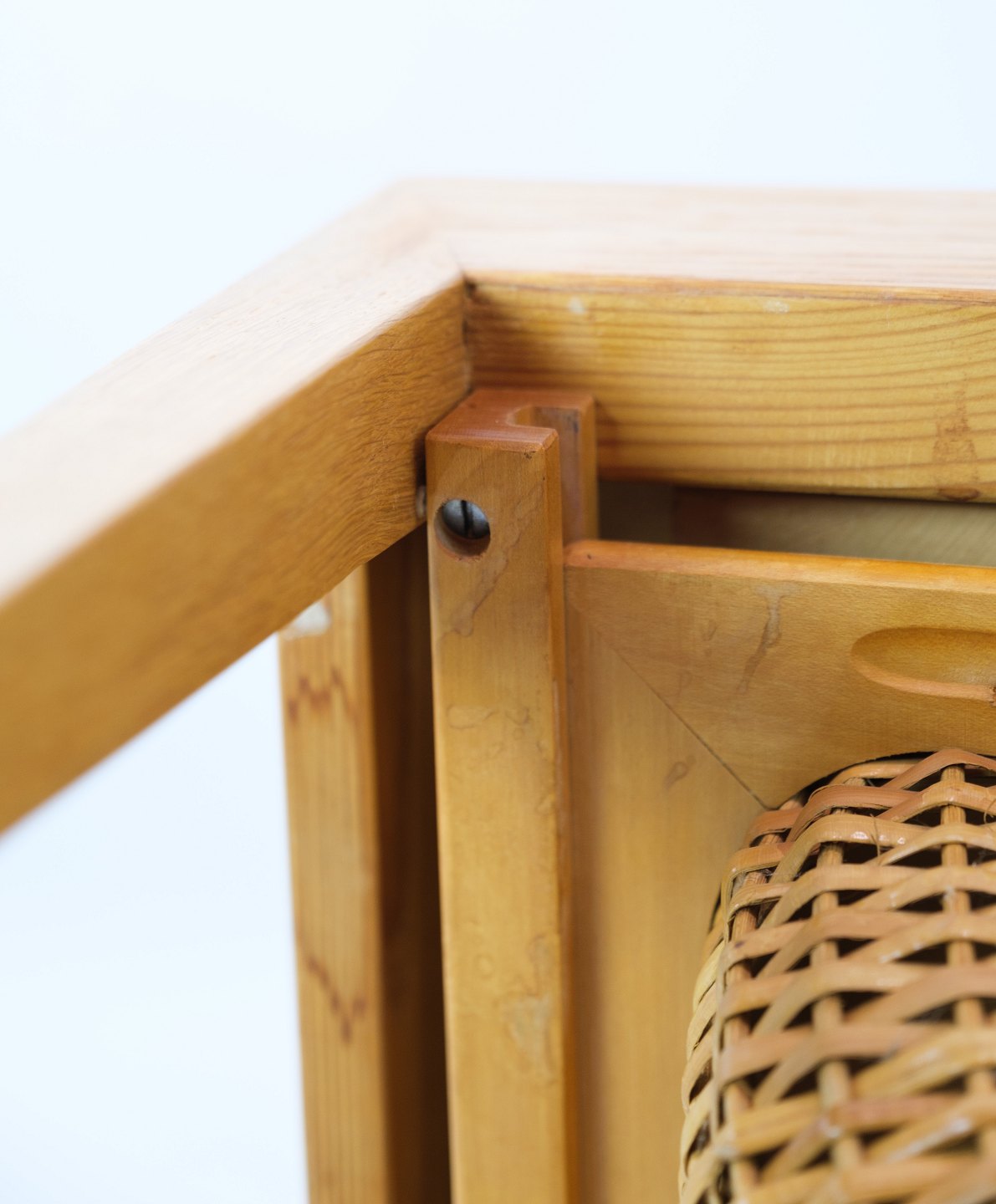 SolgtSybord / sidebord, designet af Severin Hansen i egetræ fremstillet af Haslev møbelfabrik fra 1957. Bordet har en skuffe med små rum, samt en udtrækskurv med flet.