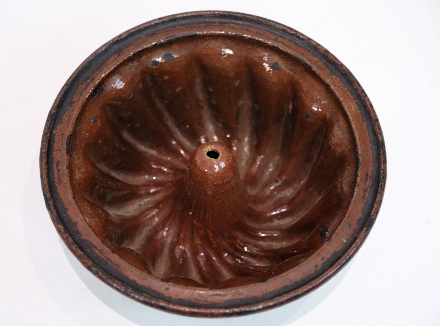 Buddingeform af lertøj i brunlige farver fra omkring år 1930'erne