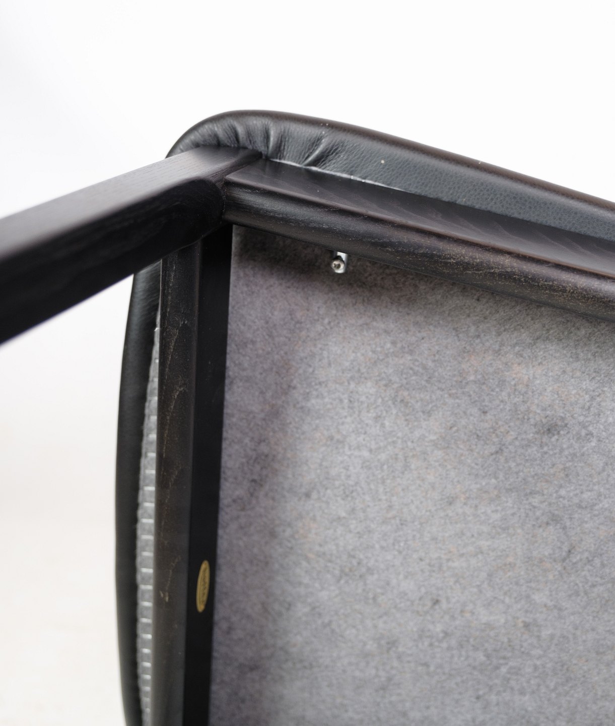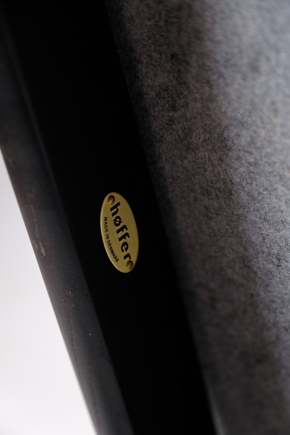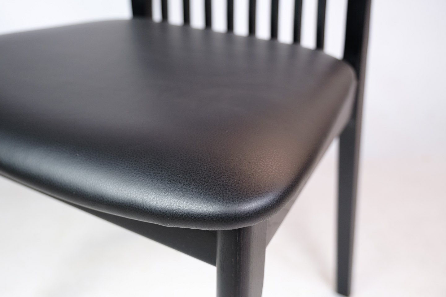 SolgtSæt af 4 spisestuestole, model 712, i sort bejdset ask fremstillet af K. Høffer Larsen A/S. Mellemhøj spisestuestol, med lodrette pinde i ryggen, der giver god siddekomfort.