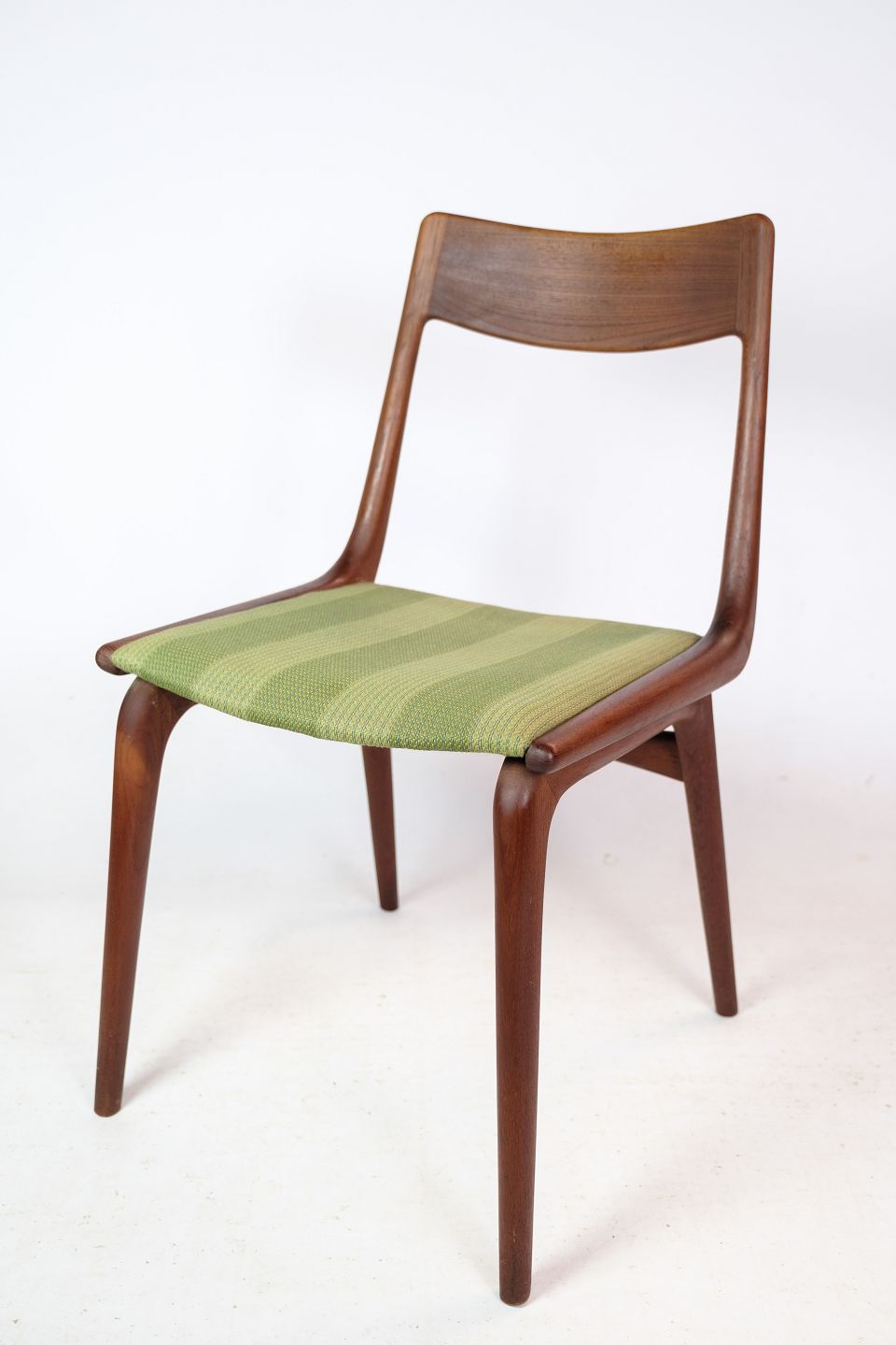 Stolene har en karakteristisk form, der giver en unik og attraktiv stil. Med deres udskårne ryglæn i form af en boomerang, giver de en unik og ergonomisk form til ryggen. Sædet er polstret med grønt stribet stof, hvilket skaber en smuk kontrast til den varme farve af teaktræet.