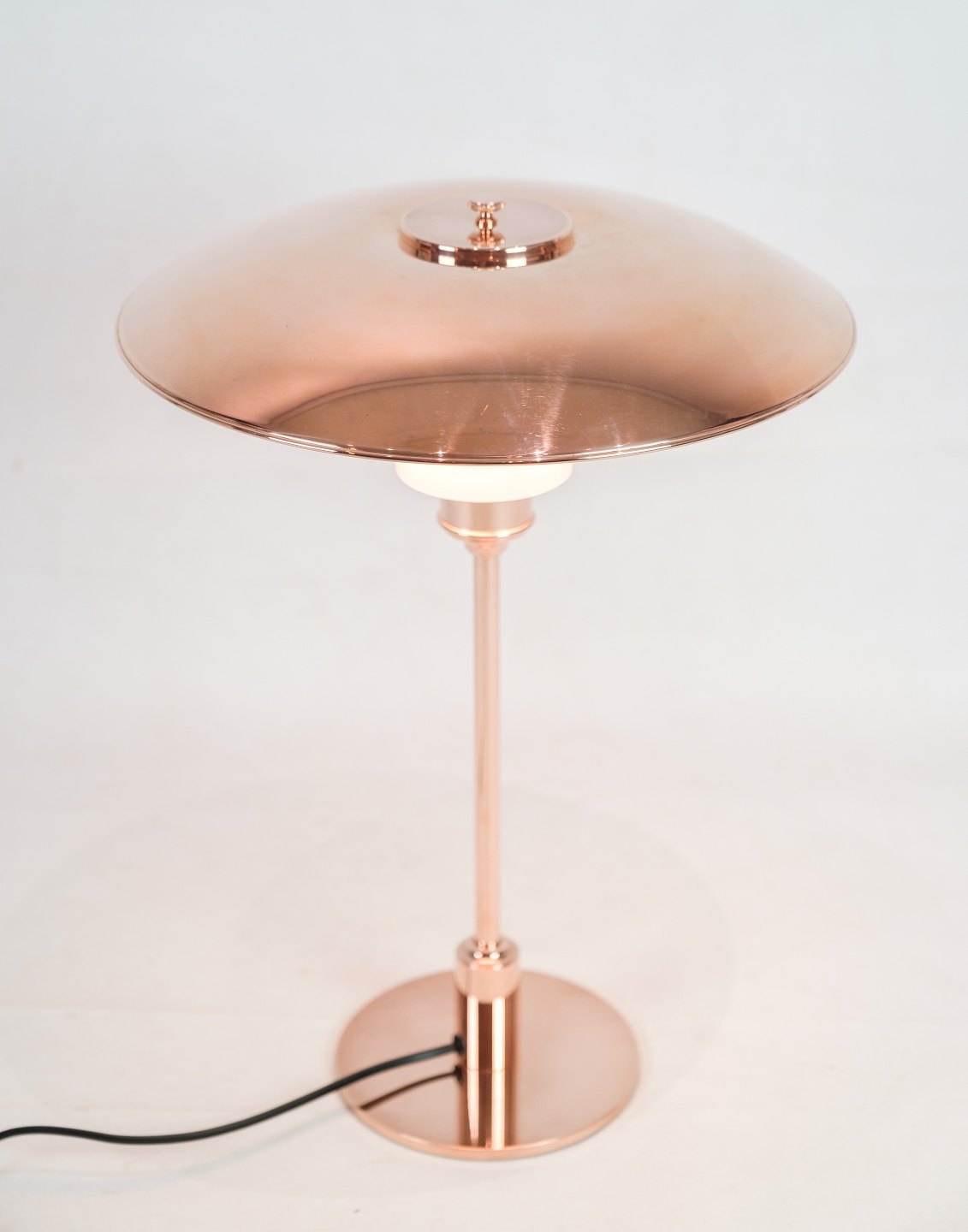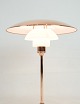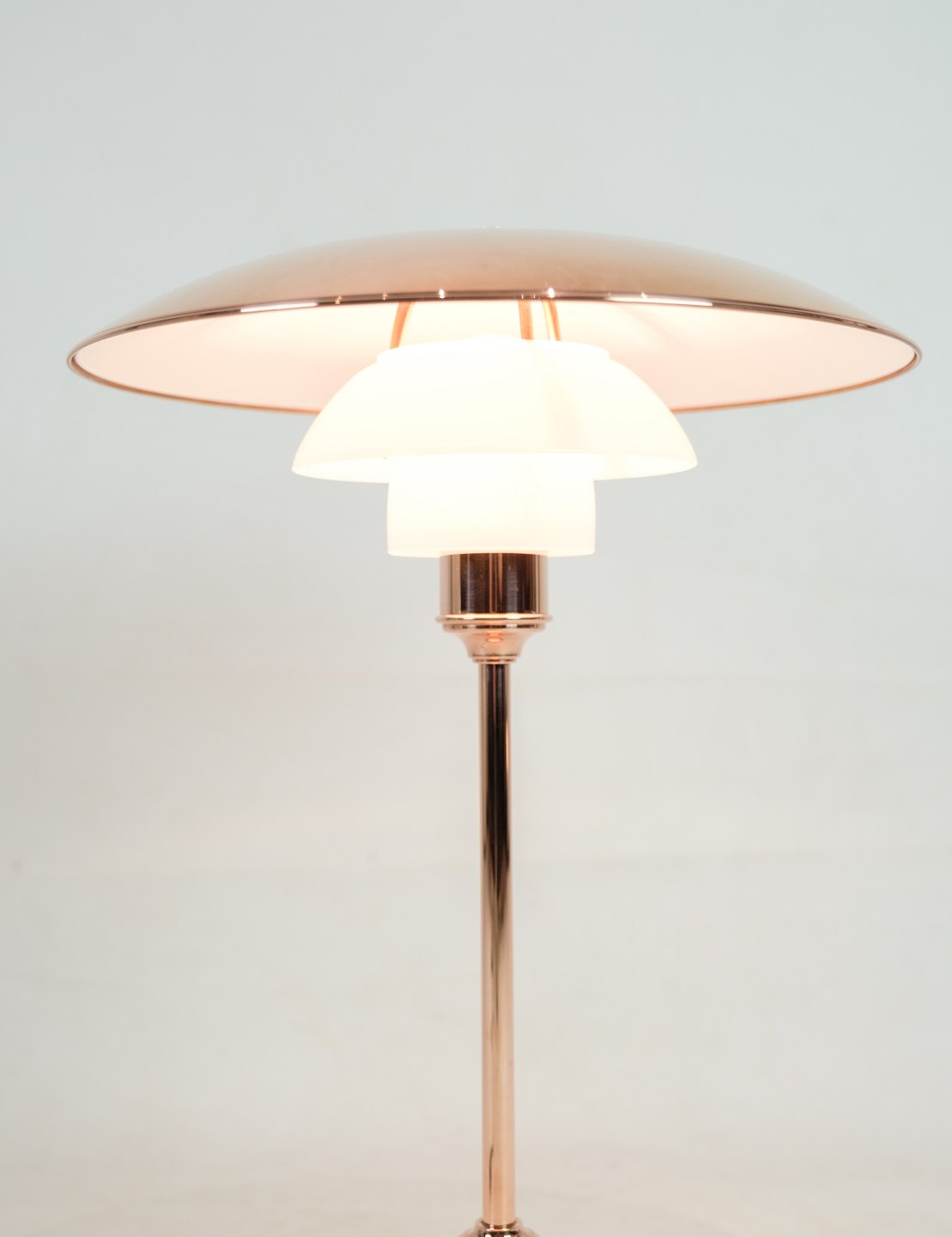 PH Table lamp, model PH3½-2½, limited edition, designed by Poul Henningsen and manufactured by Louis Poulsen. The lamp is made of copper with an upper shade in copper and two lower shades in white opal glass. An upper screen in white opal glass is also included. It was sold for a limited period in 2015. The lamp was originally only produced for 2 years in the period 1927-1929, then taken out of production, probably due to stability problems with the lamp head. Poul Henningsen put the finishing touches on the table lamp in February 1927.