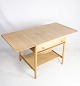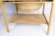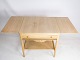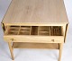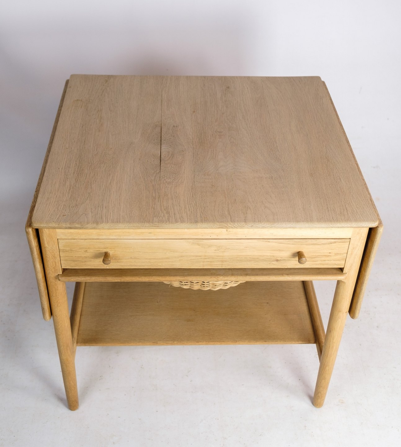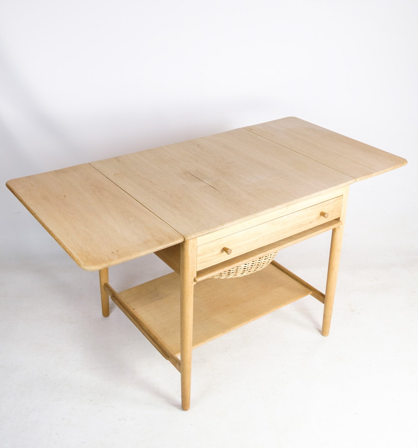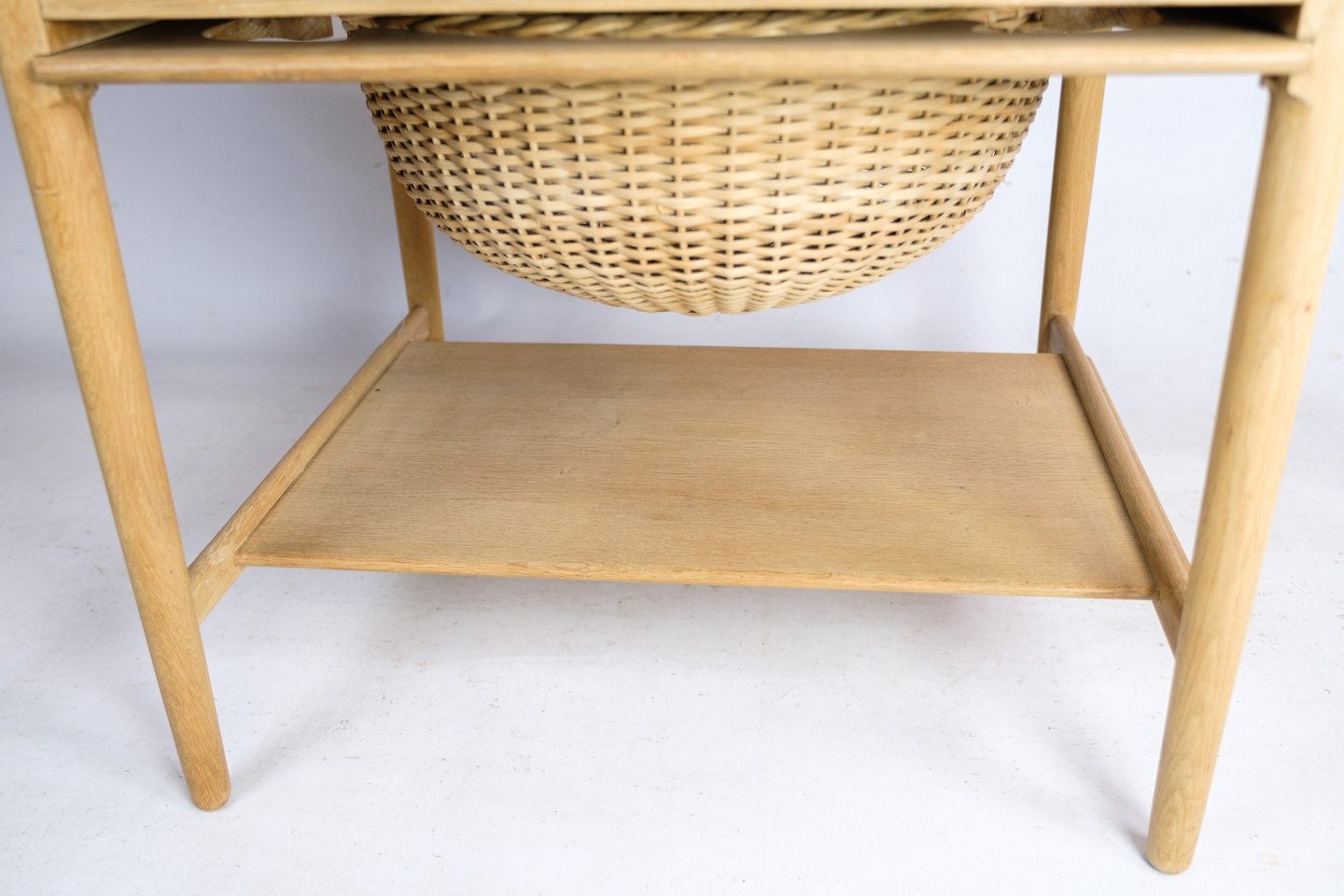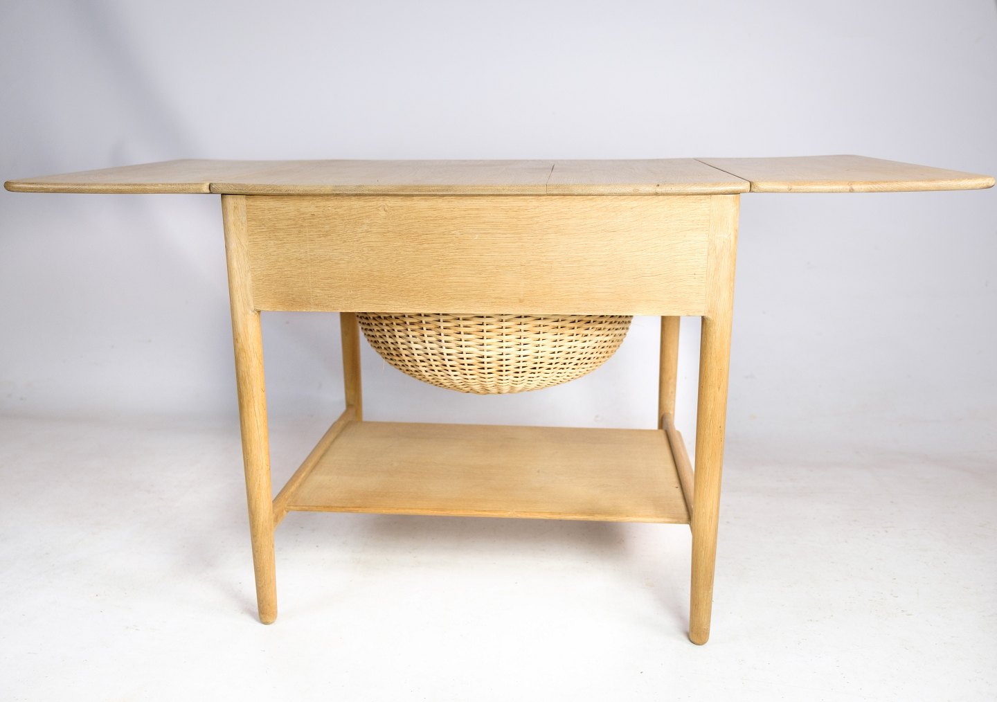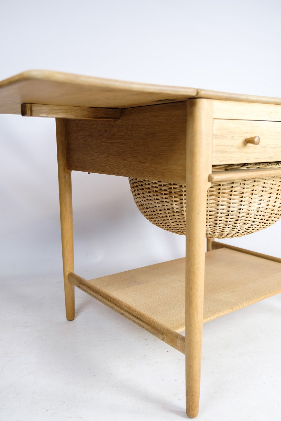 SoldSewing table in oak, designed by Hans J. Wegner with wicker basket, drawer and two folding plates from around the 1960s.
