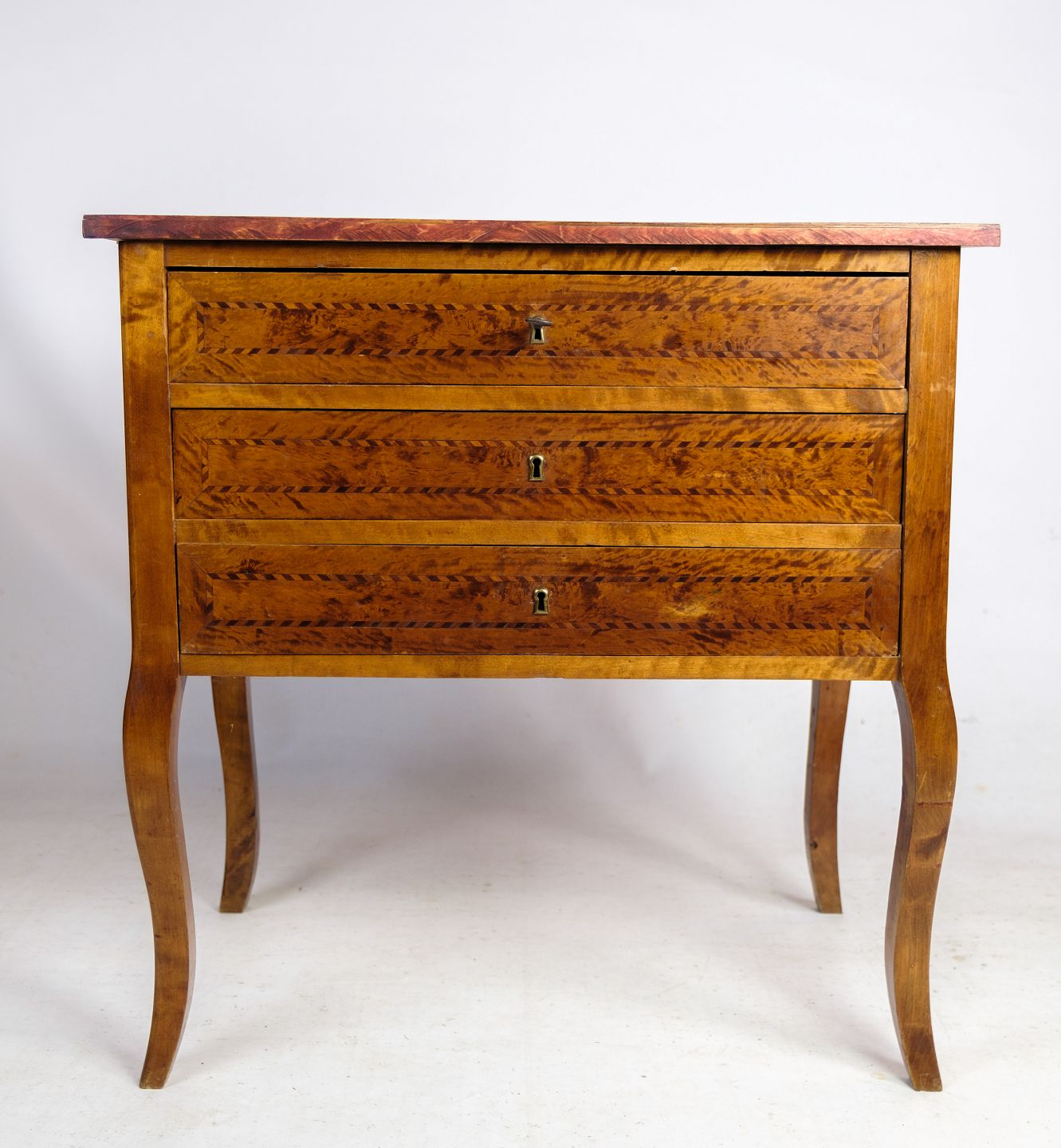 SoldAntique chest of drawers in walnut with marquetry and brass keyholes from around the 1920s. Key included.