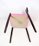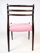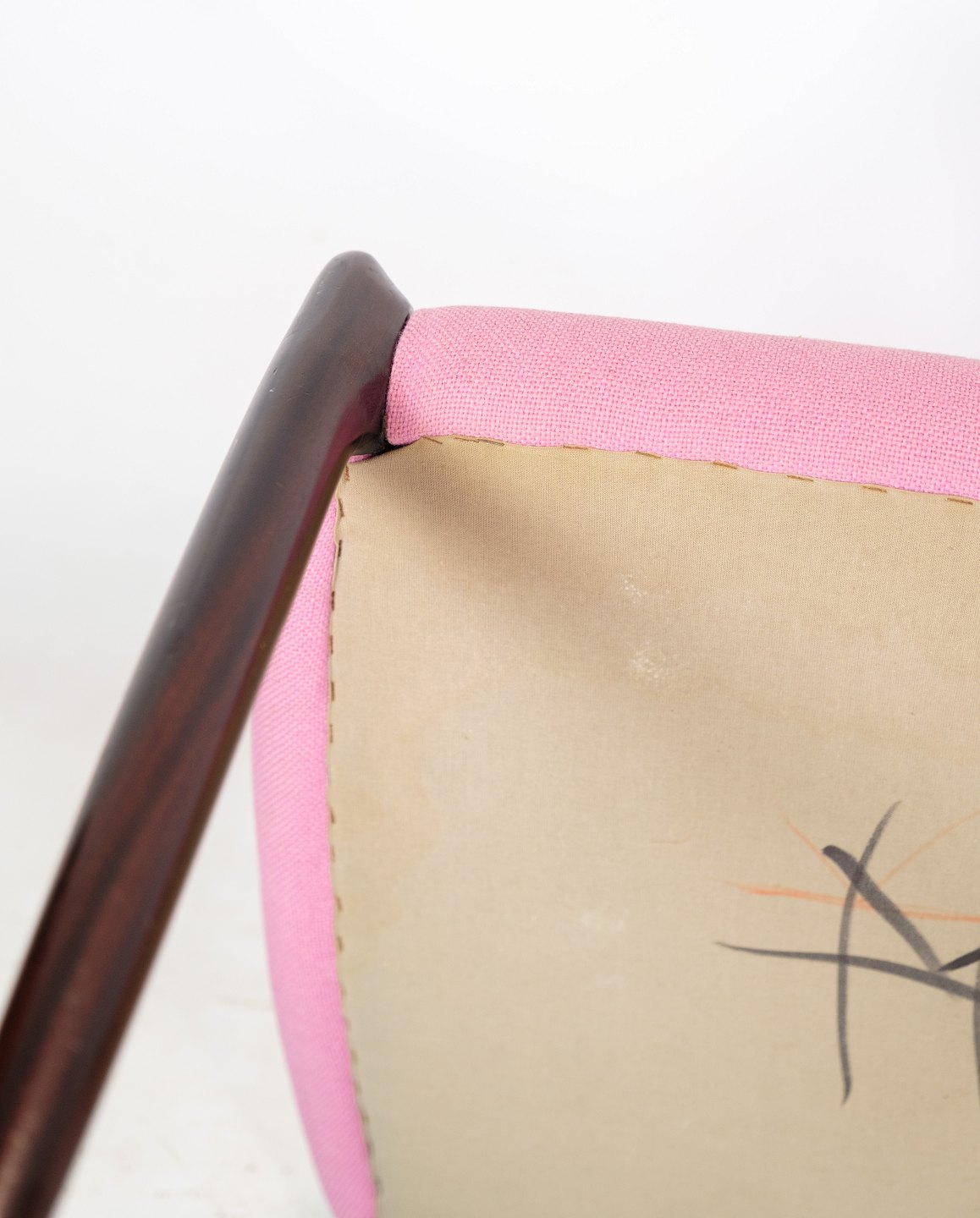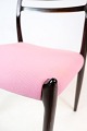 The chairs are designed to have a classic, simple style, with slim and elegant legs and a comfortable back support. The chairs are also equipped with a soft and comfortable upholstery in a pink fabric, which is in very good used condition. The fabric creates a warm and cozy atmosphere in the dining room and gives the chairs a soft and inviting appearance.