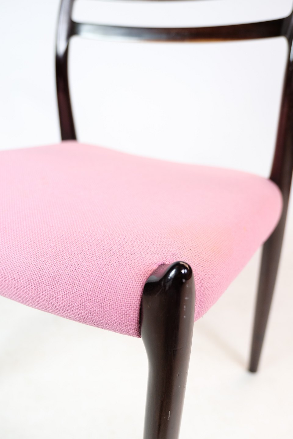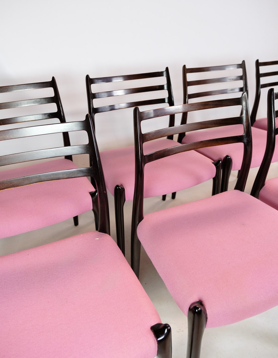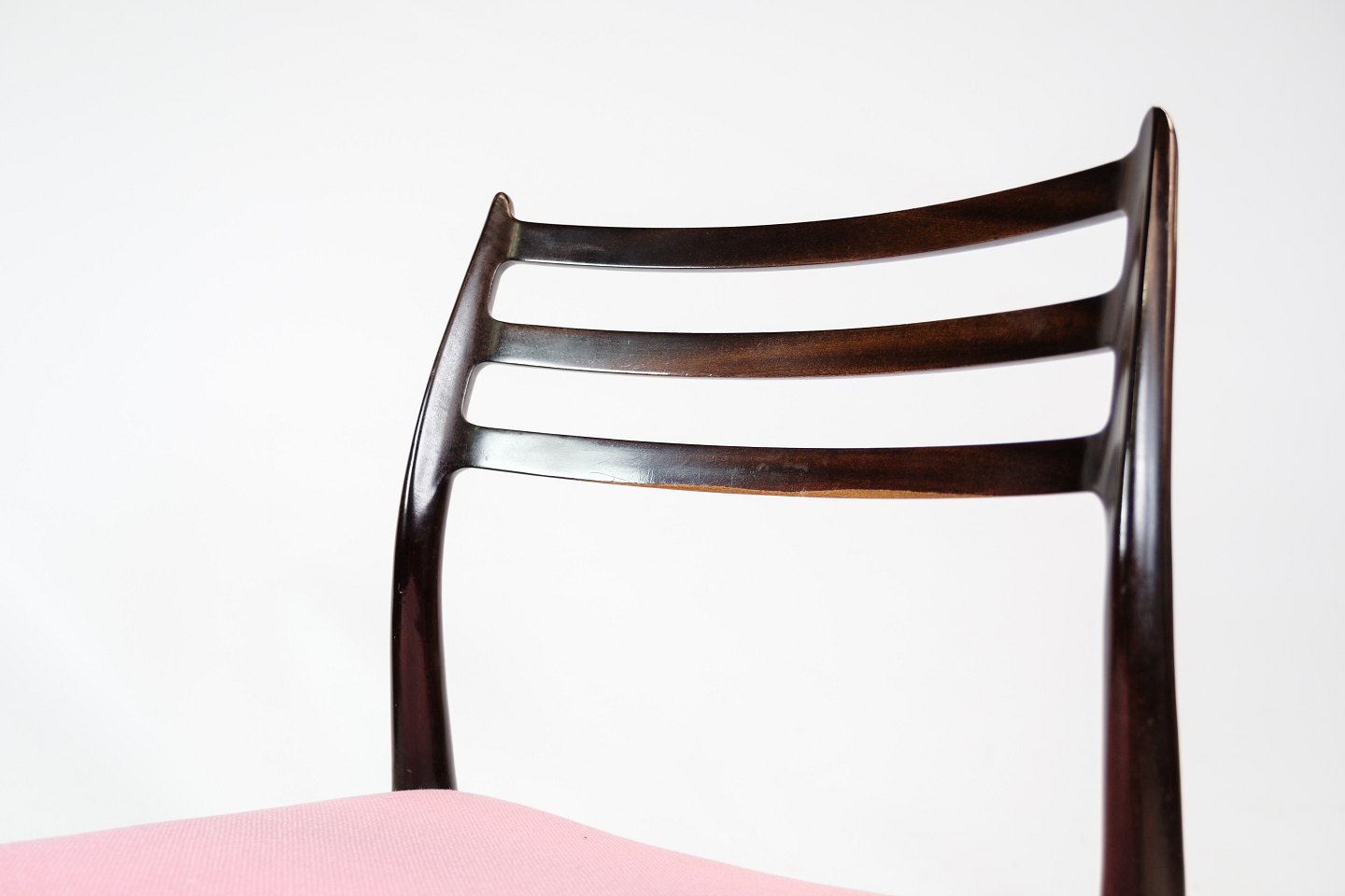 The dining table chairs model 78, designed by the Danish furniture designer N.O. Møller and manufactured by JL Møller, is an example of timeless Danish craftsmanship and design. The chairs are made of mahogany, which is a type of wood known for its durability and beauty.
