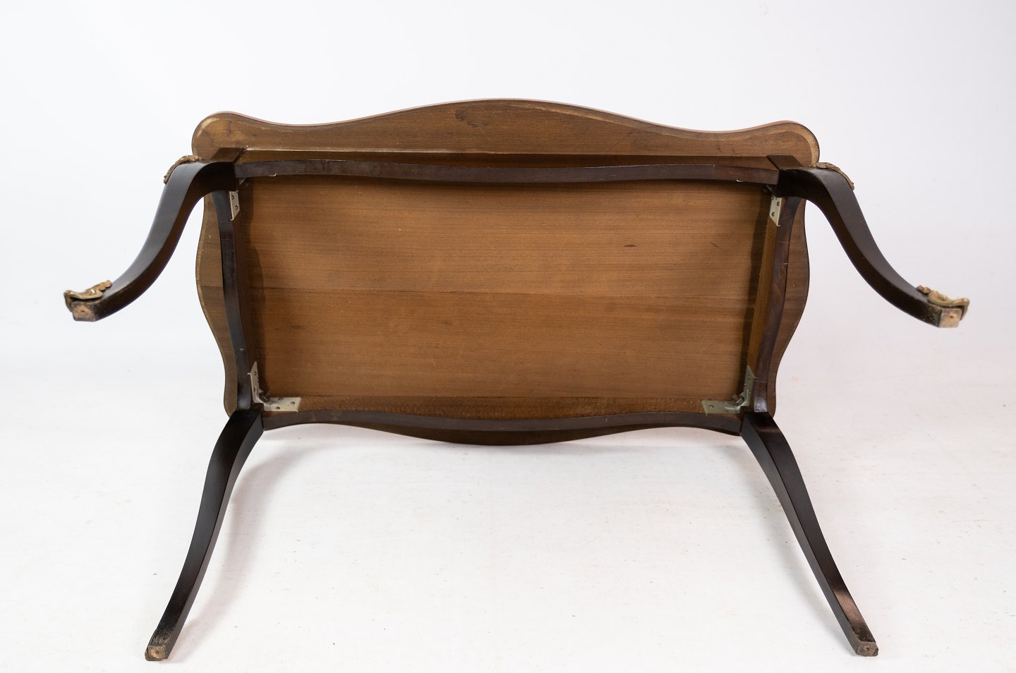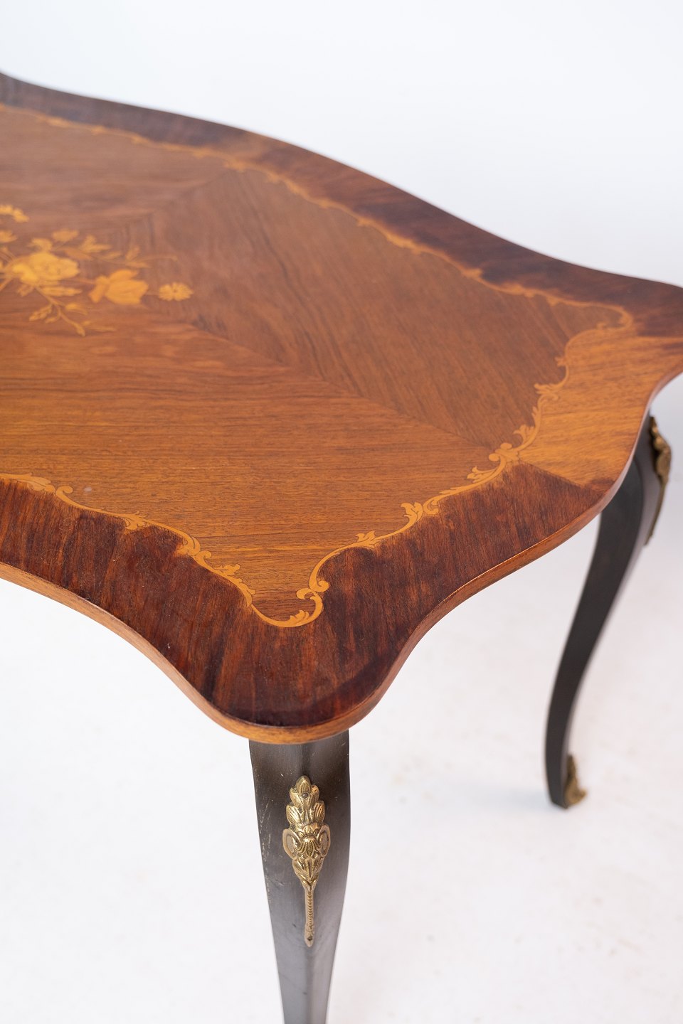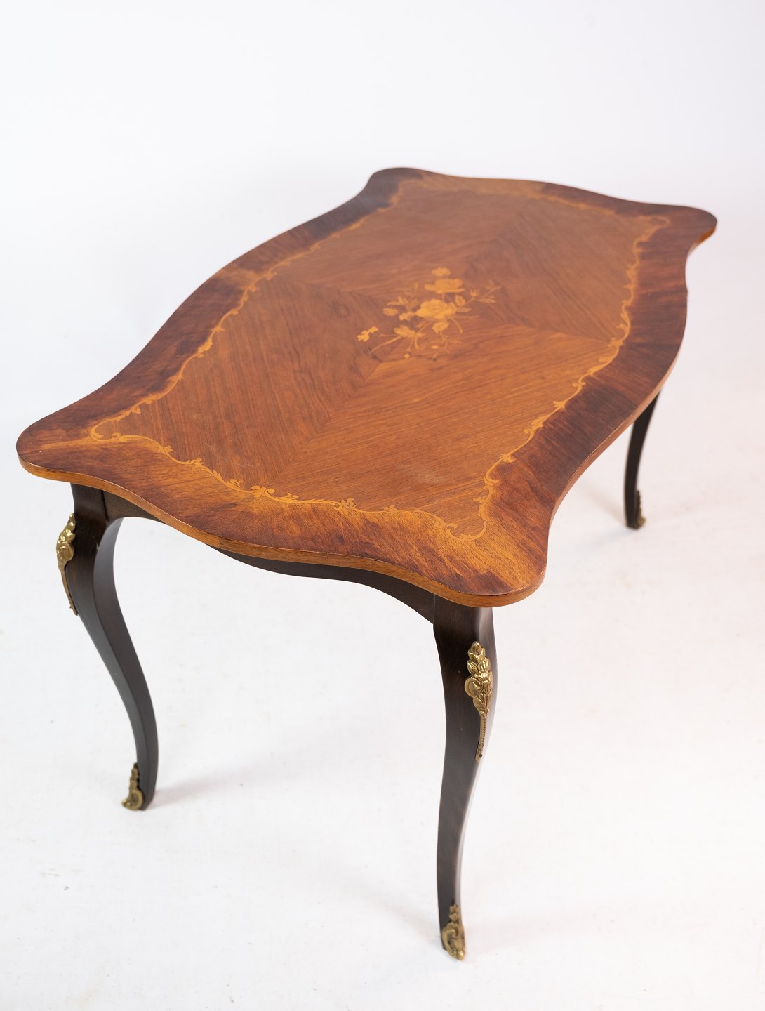Antikt sofabord af rococo stil med ben af bejdset træ med messing dekoration og overflade i rosentræ med intarsia fra omkring 1930'erne.