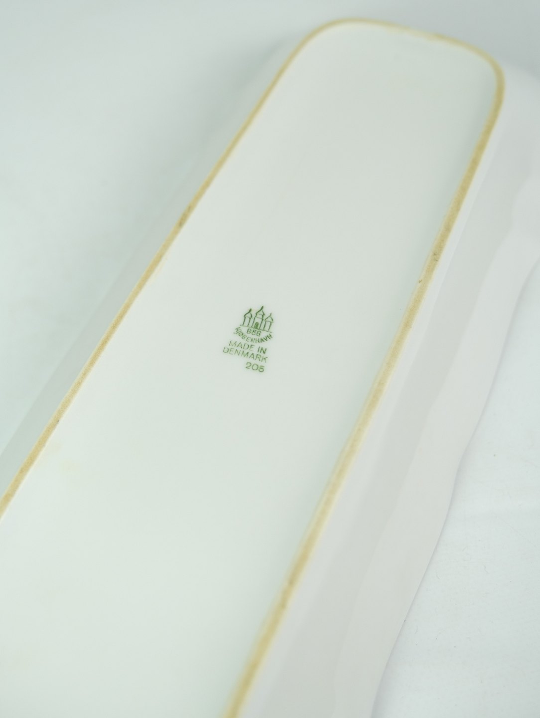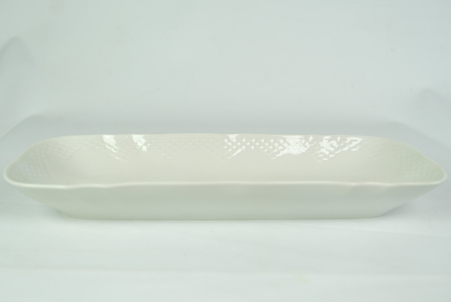Hvid riflet aflangt fad fra Bing & Grøndahl i porcelæn fra omkring år 1950'erne.